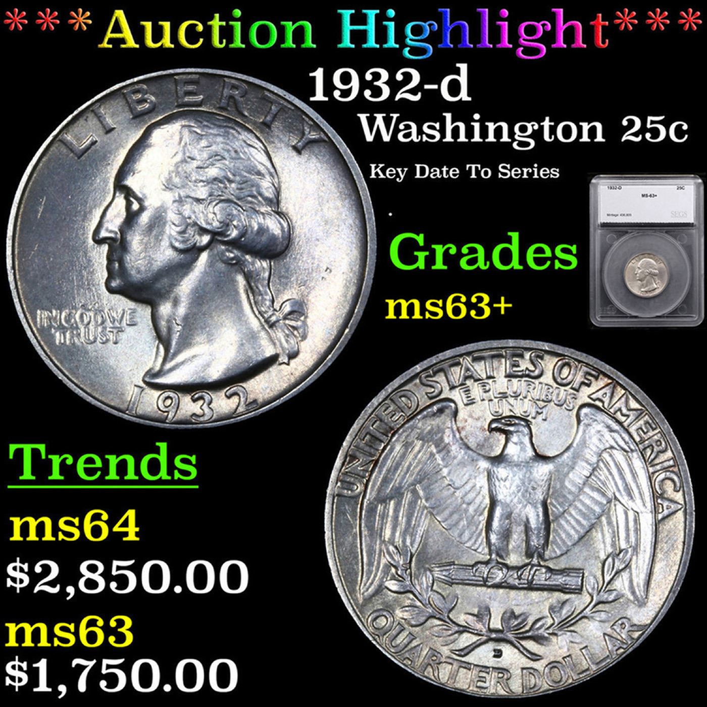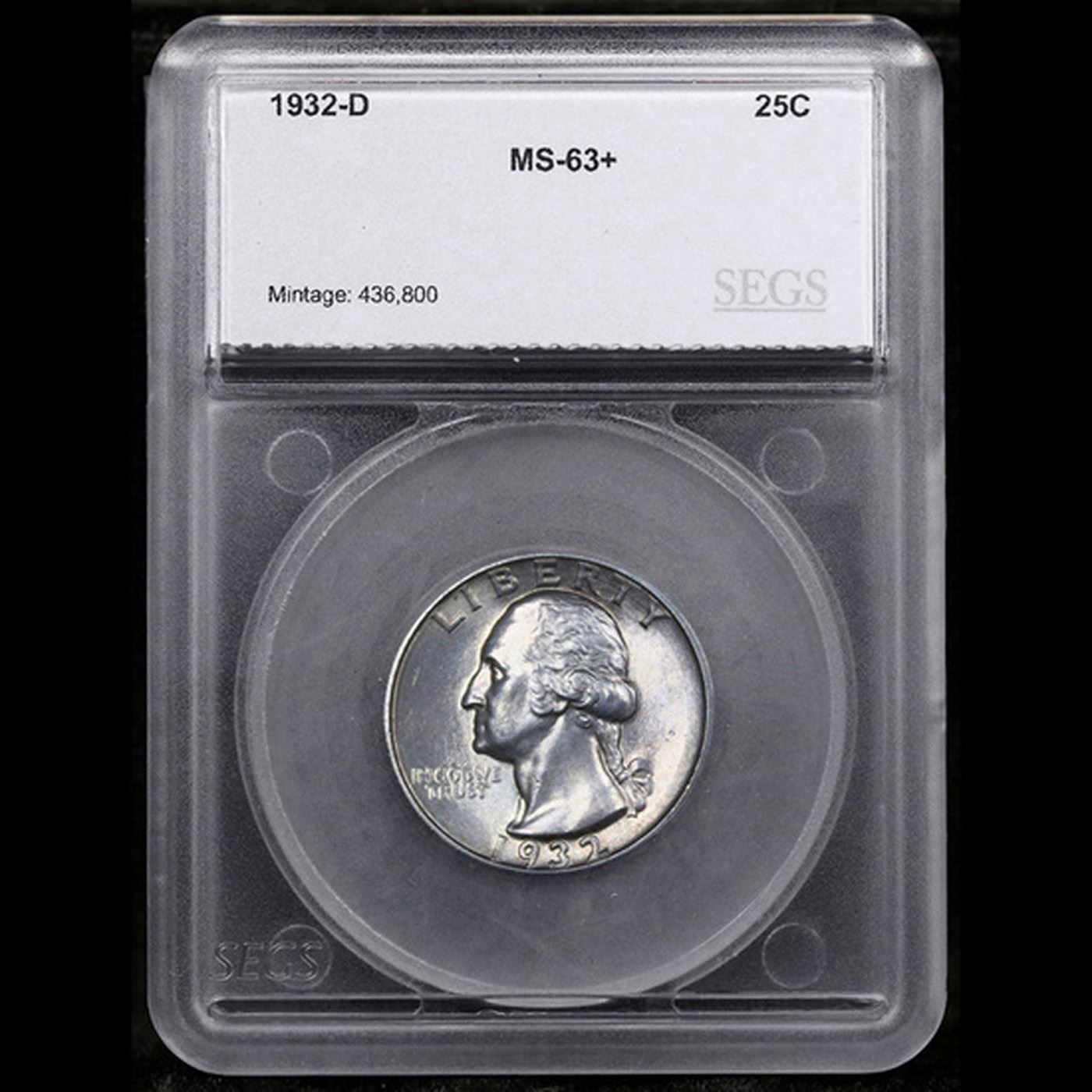 ***Auction Highlight*** 1932-d Washington Quarter 25c Graded ms63+ By SEGS. According to David Hall, from PCGS The 1932-D is by far the rarest of the Washington quarters. There are only two Washington quarters with mintages of under one million coins. The 1932-D has an original mintage of 436,800. This coin has been highly sought after in all grades for the past 60 years. This is one of the key dates of the Washington quarter series and one of the better known rare coins of the twentieth century. Very scarce Key Date. This is the key date to the seies, even more scarce than the 1932-s. Scarce in all grades.