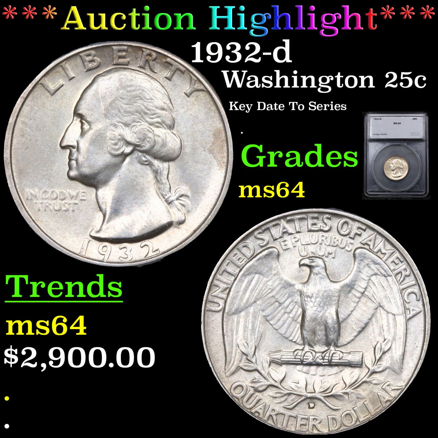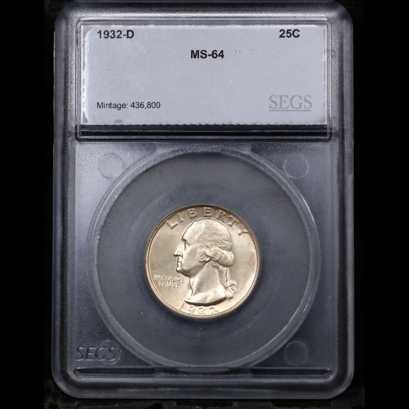 ***Auction Highlight*** 1932-d Washington Quarter 25c Graded ms64 BY SEGS. According to David Hall, from PCGS The 1932-D is by far the rarest of the Washington quarters. There are only two Washington quarters with mintages of under one million coins. The 1932-D has an original mintage of 436,800. This coin has been highly sought after in all grades for the past 60 years. This is one of the key dates of the Washington quarter series and one of the better known rare coins of the twentieth century. Very scarce Key Date. This is the key date to the seies, even more scarce than the 1932-s. Scarce in all grades. A Corey's Pick, Bid to Win, Don't let it get Away Coin
