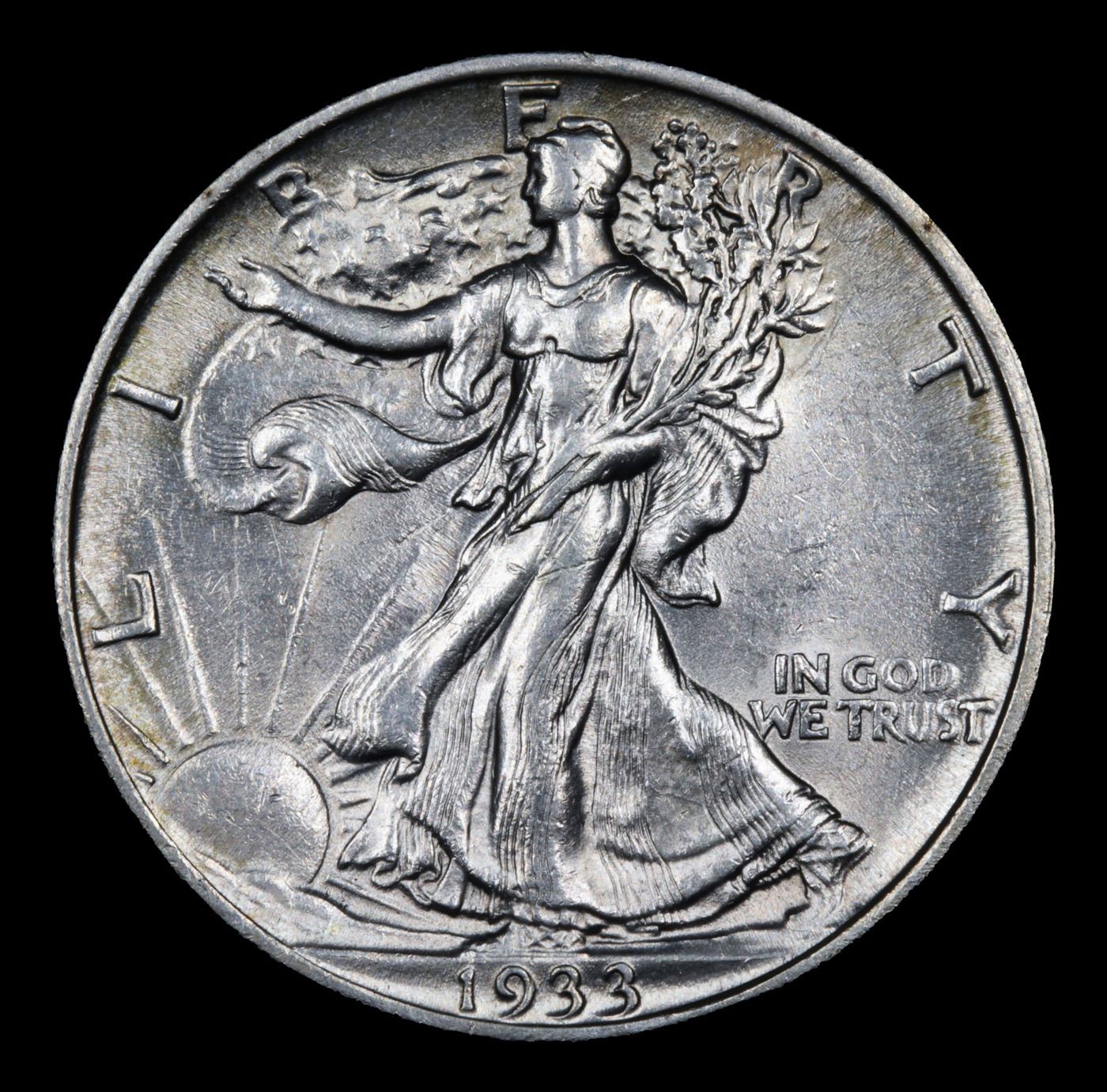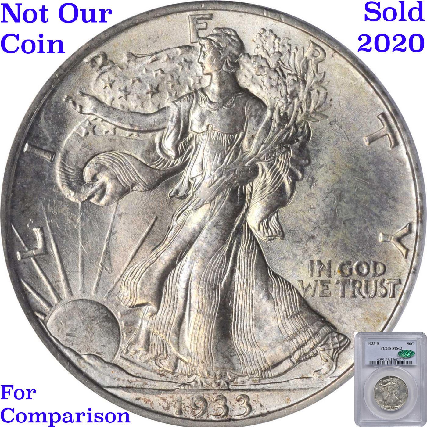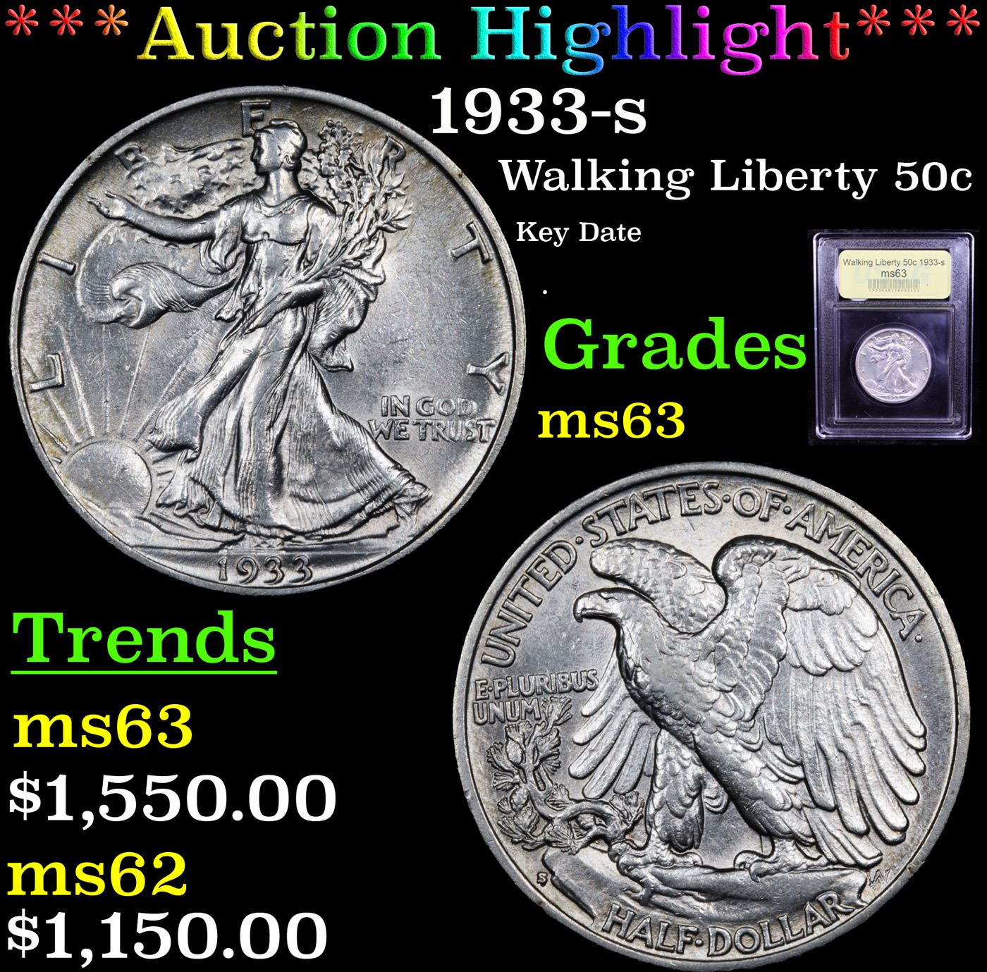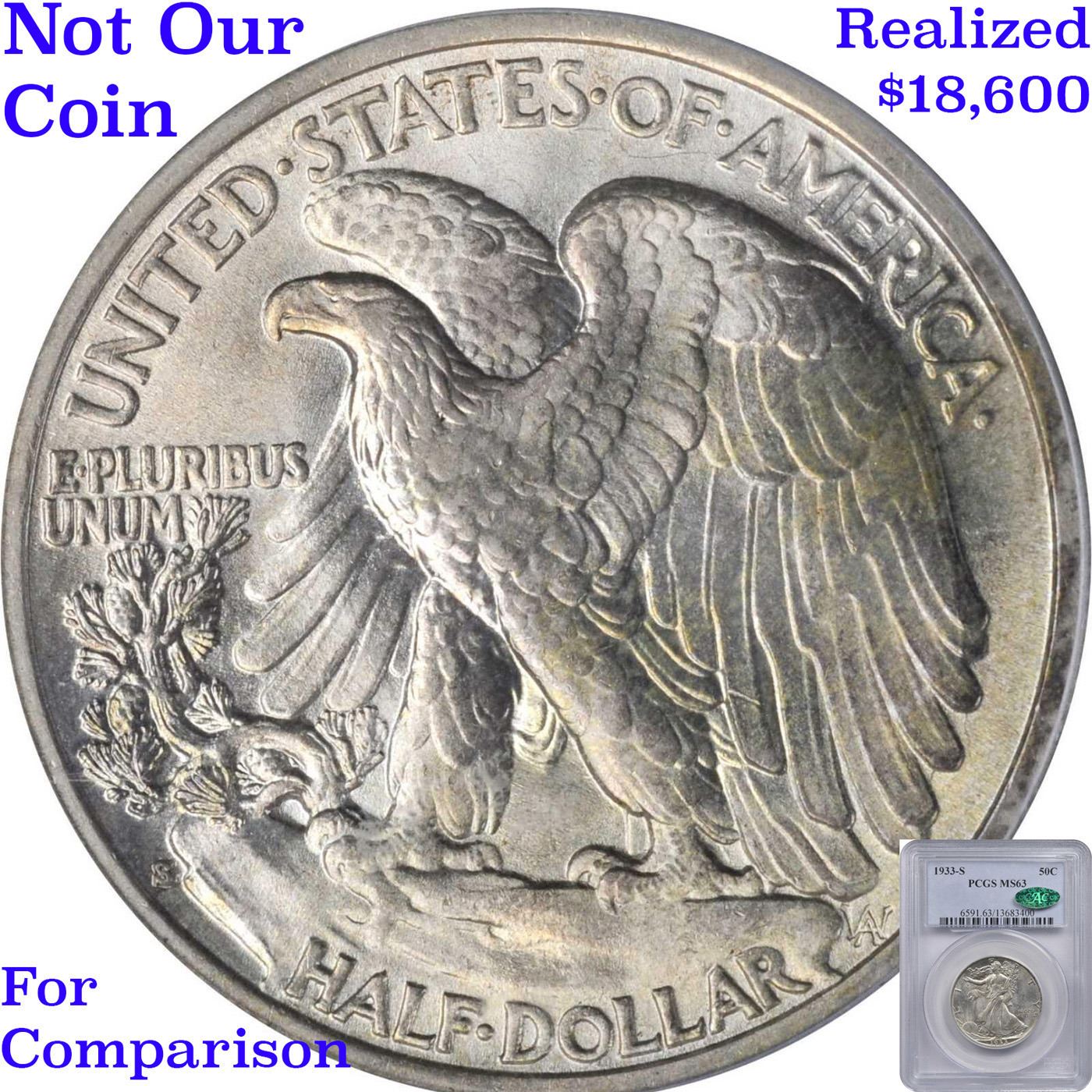 ***Auction Highlight*** 1933-s Walking Liberty Half Dollar 50c Graded Select Unc By USCG. The surfaces are radiant and each side has a nice veneer of natural patina which is predominately a reddish-golden color. Here is a carefully preserved 1933-S half dollar. We are struck by the bold, convincing design detail for all areas on the obverse with not even the slightest amount of flatness in the central design. Curious it is, when the 1923-S to 1929-S issues are most always weak to miserably weak in these areas, and followed by almost the same lack of quality control in 1934-S and 1935-S. I am including another picture of an ms63 graded by pcgs s ms63 for your comparison. A Corey's Pick, Bid to Win, Don't let it get Away Coin