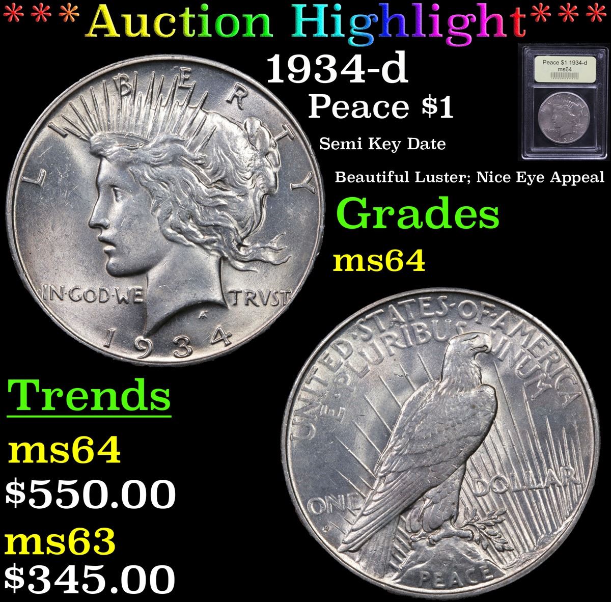 ***Auction Highlight*** 1934-d Peace Dollar $1 Graded Choice Unc By USCG. A Corey's Pick, Bid to Win Coin
