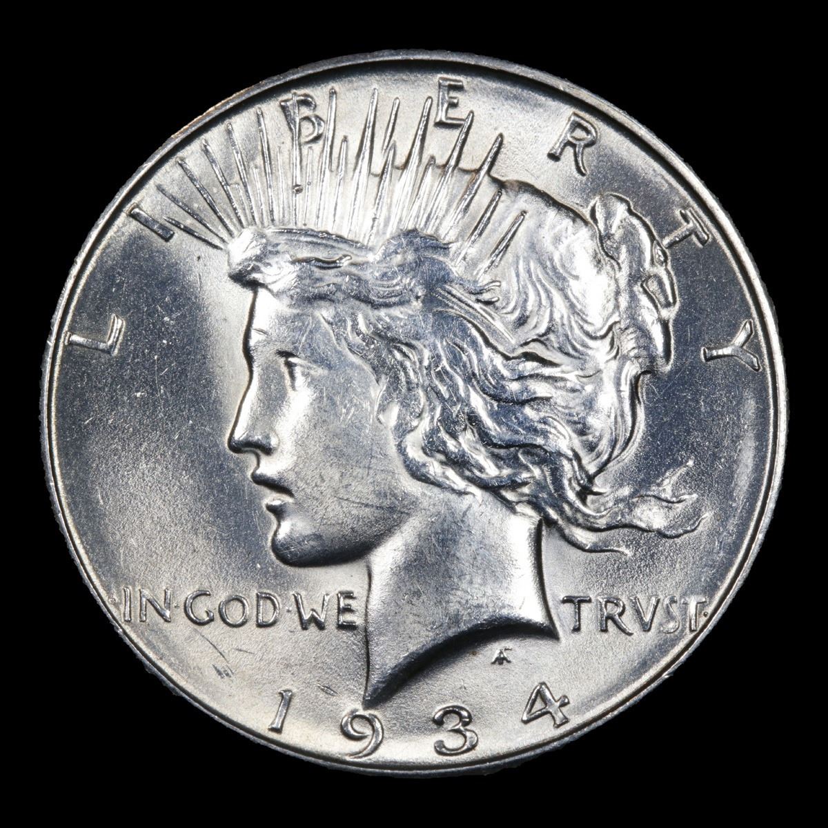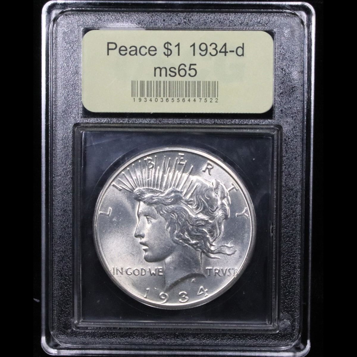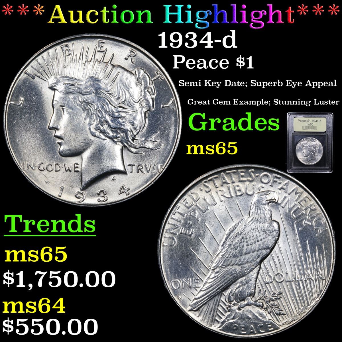***Auction Highlight*** 1934-d Semi Key Date; Superb Eye Appeal Great Gem Example; Stunning Luster Peace Dollar $1 Graded GEM Unc By USCG. A Corey's Pick, Bid to Win, Don't let it get Away Coin