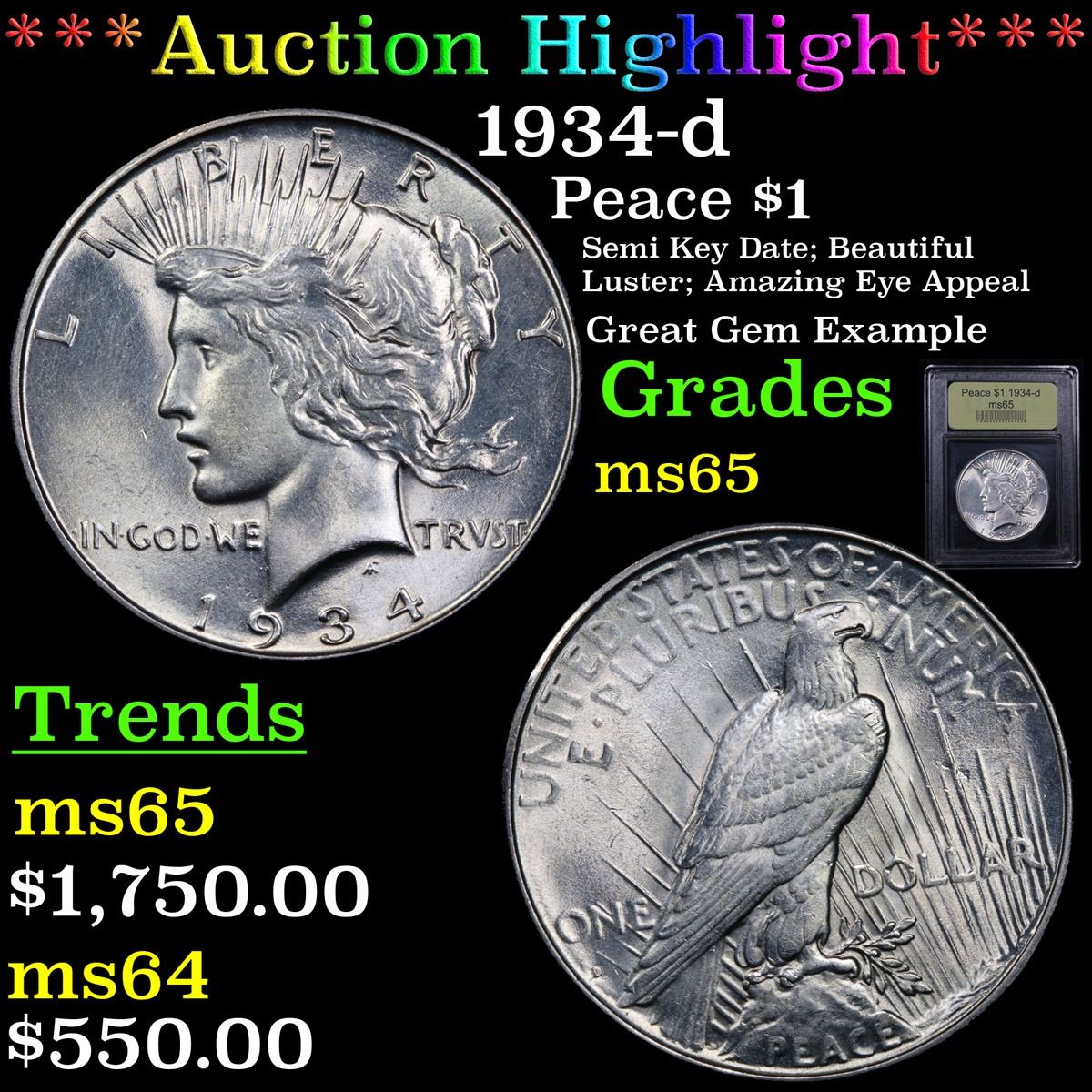 ***Auction Highlight*** 1934-d Peace Dollar $1 Graded GEM Unc By USCG.