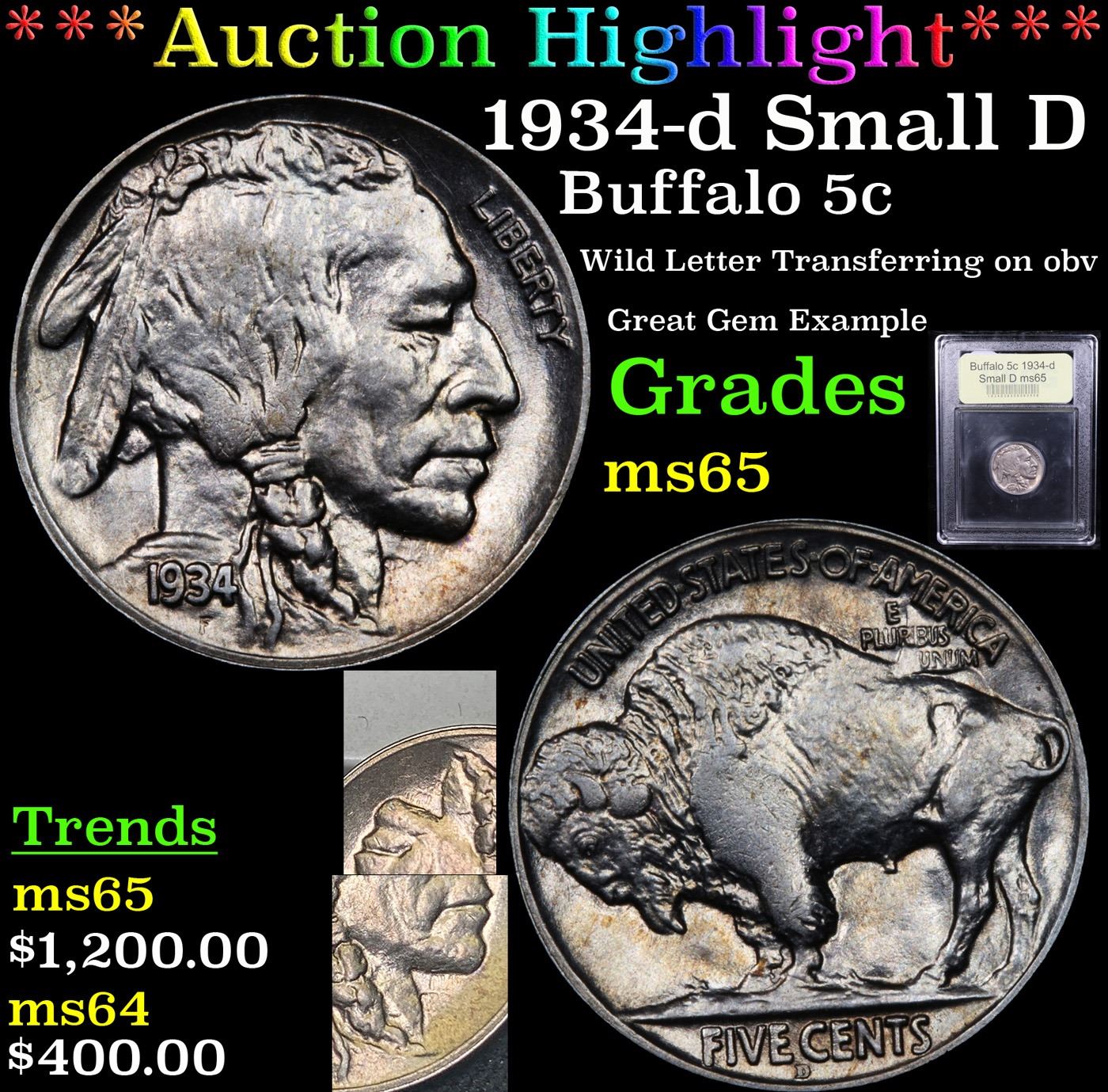 ***Auction Highlight*** 1934-d Small D Buffalo Nickel 5c Graded GEM Unc BY USCG. Up for Auction is a Wild Coin. It is the Small D Variety, which is much rarer than the large D, but the very cool part is the wild letter transferred clashing on the obverse. You can actually read UNM, and part of Pluribus. Great Coin A Corey's Pick, Bid to Win, Don't let it get Away, you might not find its equal Coin. I give this coin my highest recommendation
