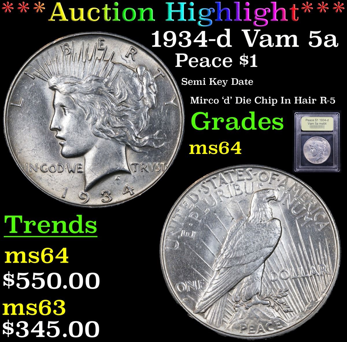 ***Auction Highlight*** 1934-d Vam 5a Peace Dollar $1 Graded Choice Unc By USCG. 0