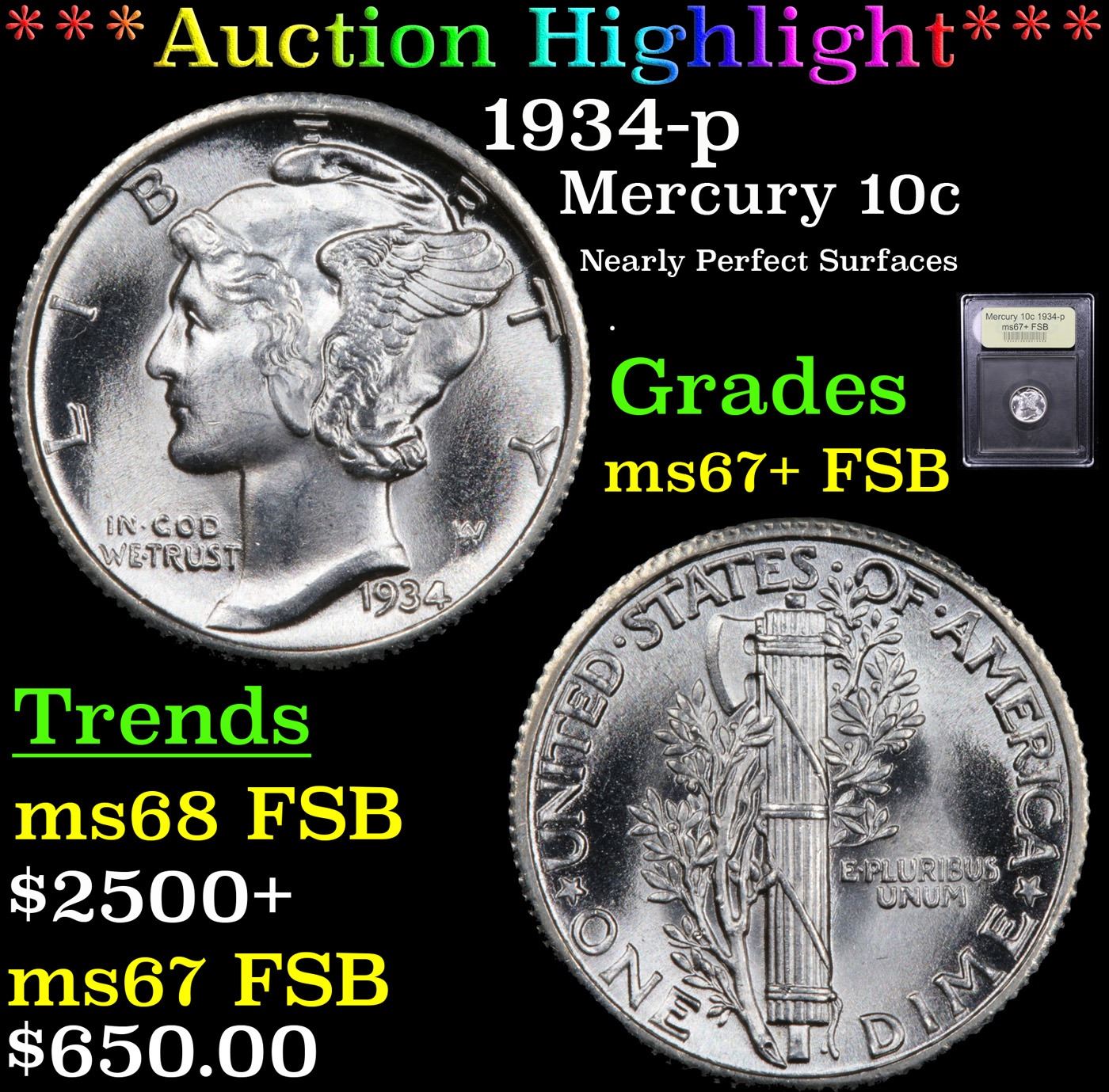 ***Auction Highlight*** 1934-p Mercury Dime 10c Graded GEM++ FSB By USCG. Few series are collectible in grades higher than MS65, but Mercury dimes are generally available in superior condition, at least the issues from the 1930s and 1940s. This piece is essentially perfect. The surfaces display glowing mint luster and each side is unaffected by post-striking defects. Both sides are brilliant while. A Corey's Pick, Bid to Win, Don't let it get Away, you might not find its equal Coin