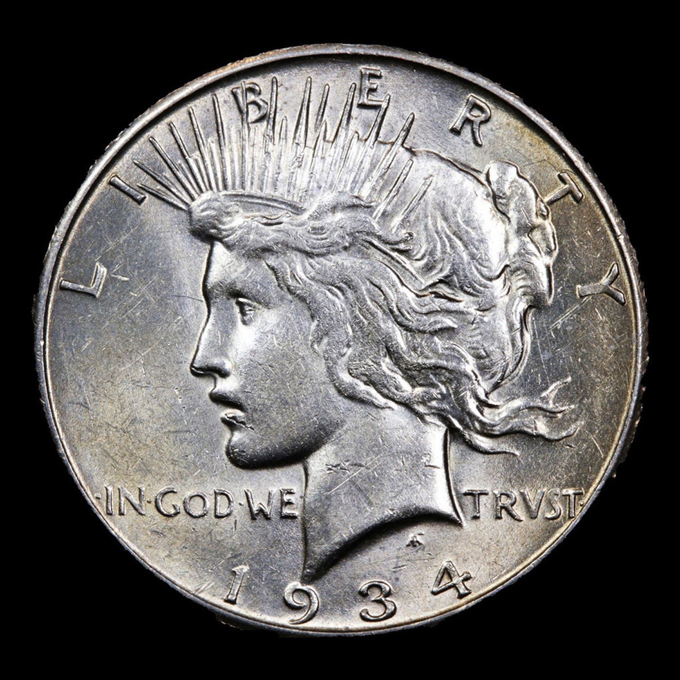 ***Auction Highlight*** 1934-s DDO Vam 3 Top 50 Peace Dollar 1 Graded Select Unc By USCG. A Top 50 Variety. Die doubling is noticeable on the rays in Liberty's tiara. This lustrous key-date representative is pleasantly free from relevant marks, and is originally toned in delicate ice-blue and almond-gold. A sharply defined example. A Corey's Pick, Bid to Win, Don't let it get Away, you might not find its equal Coin