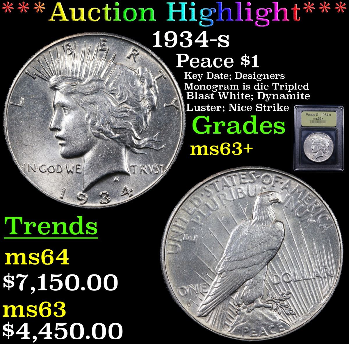 ***Auction Highlight*** 1934-s Peace Dollar $1 Graded Select+ Unc By USCG. Up for Auction is the Key to the Mint State Peace Dollars, the 1934-s. Though the low mintage 1928 commands higher prices in well circulated grades, the 1934-S is the scarcest issue in Mint State. The present Blast White example offers dynamic luster and a nice strike. Very attractive for the designated grade. The designer's monogram is die tripled, but the variety has yet to be listed at VAMworld.com. A Corey's Pick, Bid to Win, Don't let it get Away, you might not find its equal Coin. I give this coin my highest recommendation