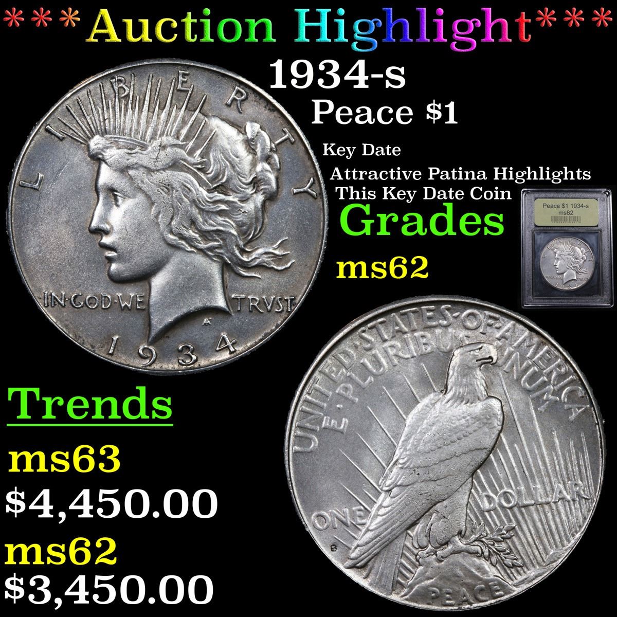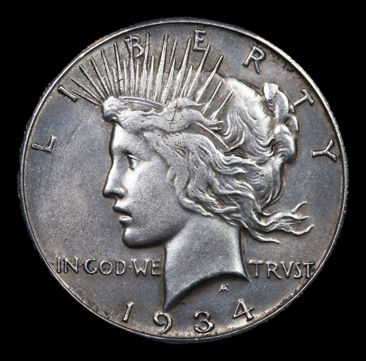 ***Auction Highlight*** 1934-s Peace Dollar $1 Graded Select Unc By USCG. Stunning Patina with beautiful luster highlight this select Uncirculated example. Dusted with light gray iridescence. Although it did not have the lowest mintage issue in its series, the 1934-S has long been recognized as the rarest Peace dollar in terms of total number of Mint State coins believed extant. Writing in his 1993 reference Silver Dollars & Trade Dollars of the United States: A Complete Encyclopedia, Q. David Bowers speculates that many of the 1,011,000 pieces minted went into circulation as early as the mid to late 1930s, most being paid out for face value from the San Francisco Mint or West Coast banks. Dealers and other numismatists active in the market of the 1940s paid little attention to the 1934-S, falsely believing that thousands of Mint State coins were still safely tucked away in vaults at the San Francisco Mint. When such pieces failed to emerge during the 1950s or early to mid 1960s, the key date status of the 1934-S in Uncirculated preservation was solidified. A Corey's Pick, Bid to Win, Don't let it get Away, you might not find its equal Coin. I give this coin my highest recommendation