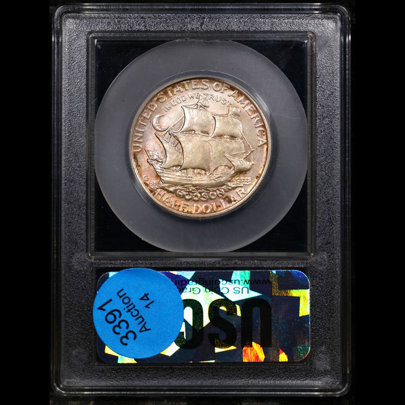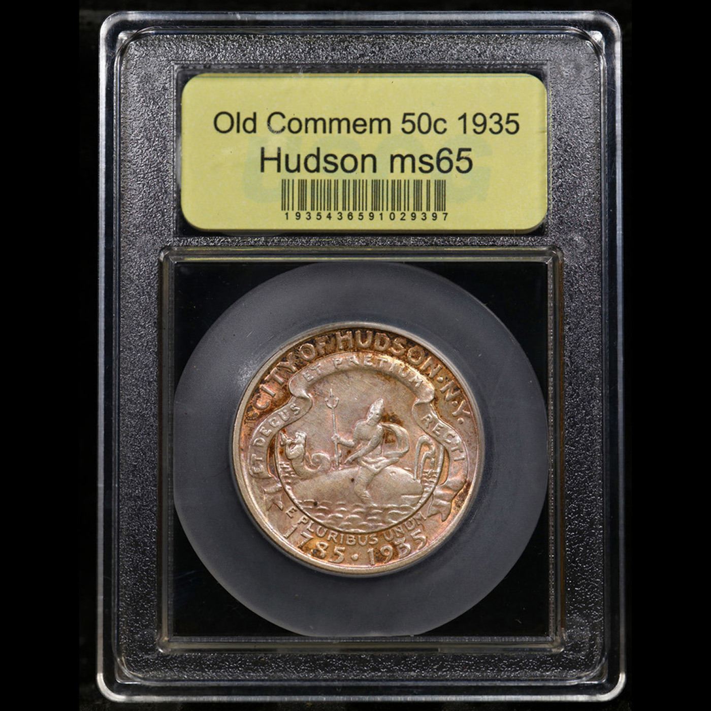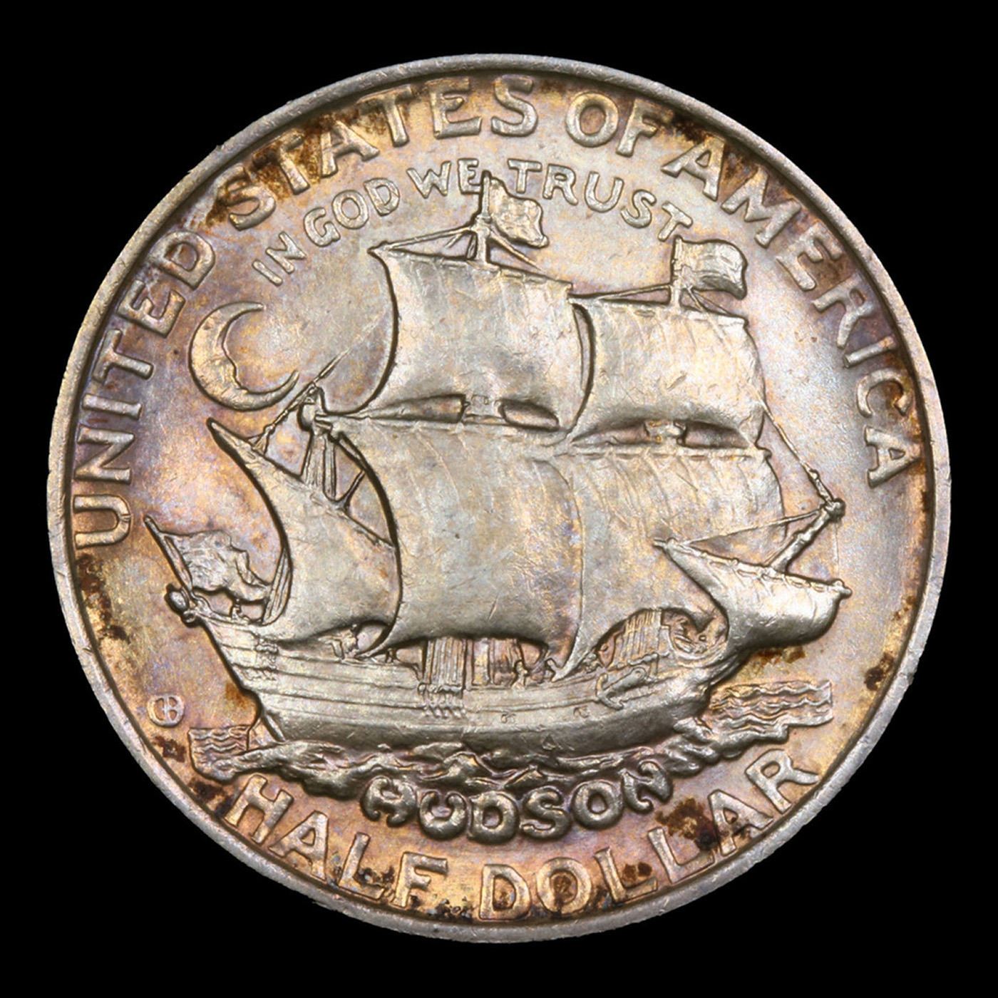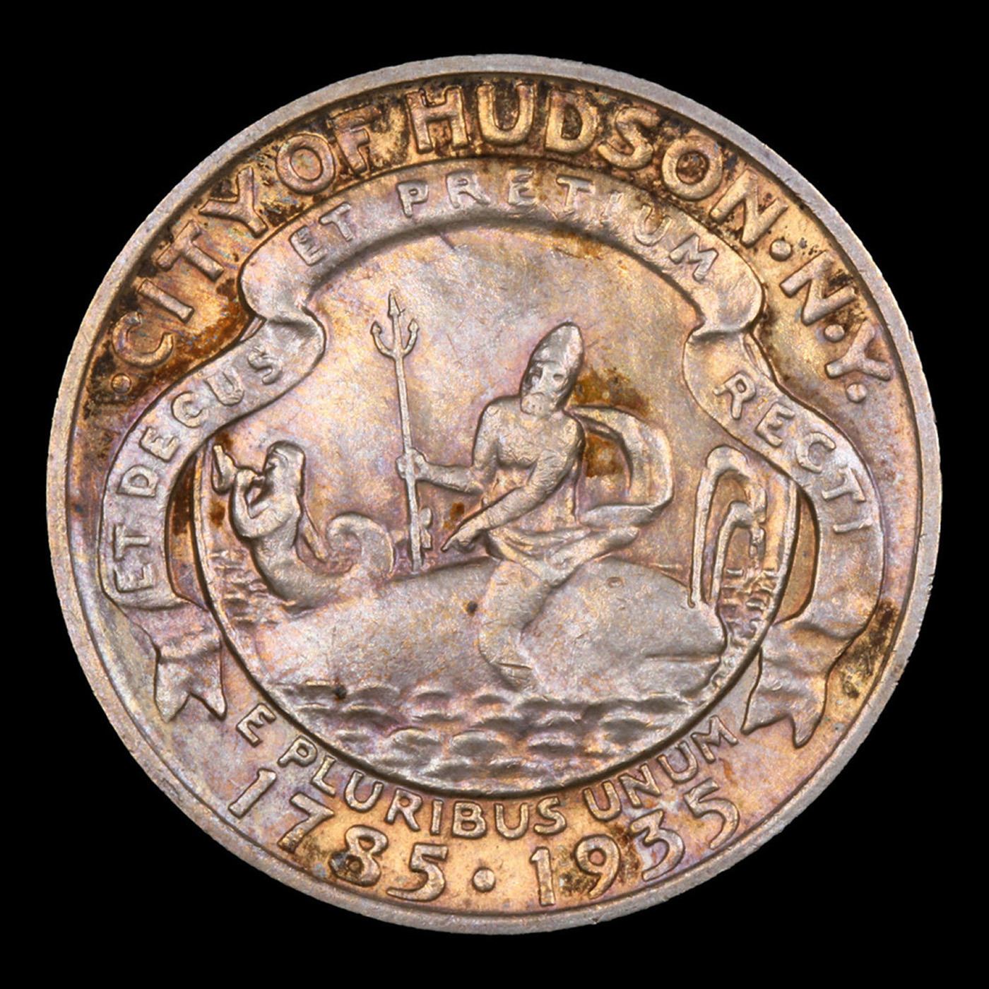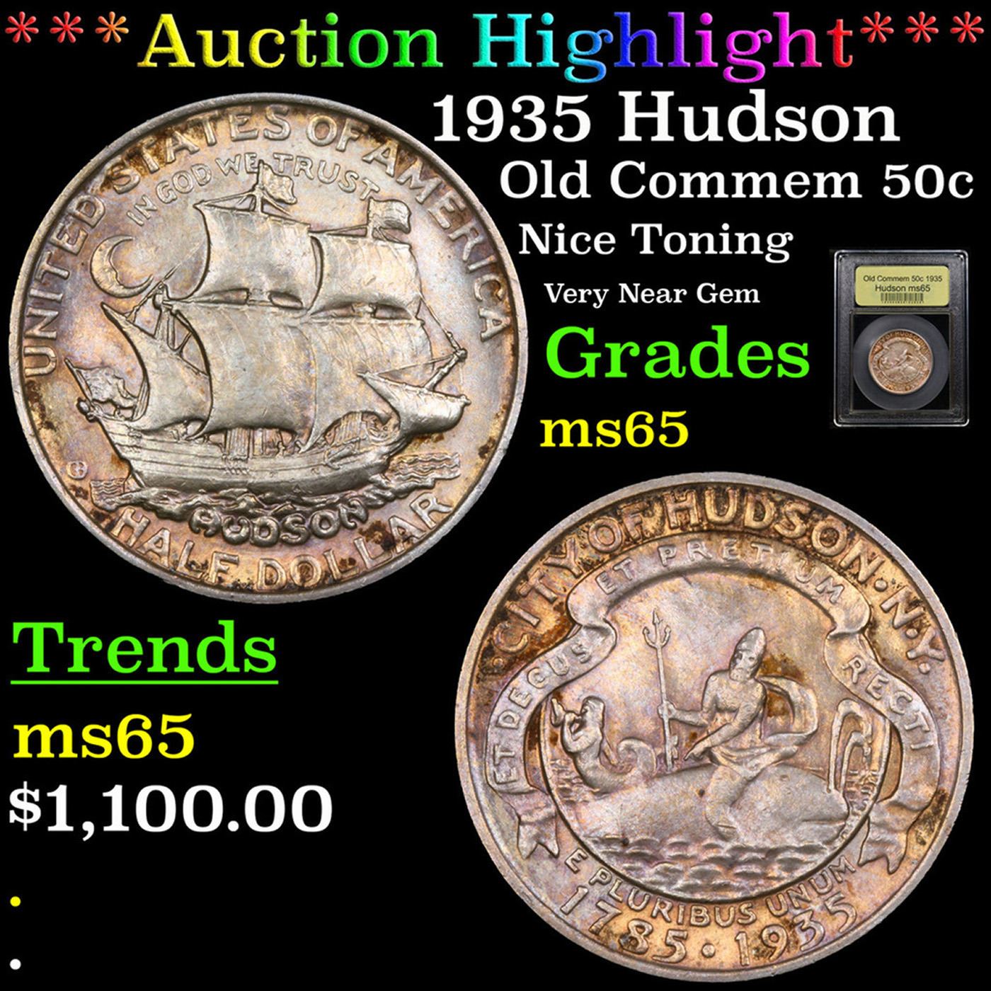 ***Auction Highlight*** 1935 Hudson Old Commem Half Dollar 50c Grades GEM Unc By USCG. The Hudson Sesquicentennial Half Dollar was issued to celebrate the 150th anniversary of a small community in New York, named for the famous explorer Henry Hudson. The issue became another source of controversy after seemingly few of the coins were offered for sale directly to the public. The designs for the coin were prepared by Chester Beach, who earlier had designed the 1923 Monroe Half Dollar and 1935 Lexington-Concord Half Dollar. His design for the present coin featured an image recalling the seal of the city of Hudson on the obverse. The god Neptune sits backwards on a whale, while holding his trident. A mermaid appears to the left, blowing a conch shell. A banner above the image reads “Et Decus Et Pretium Recti” (Both the Honor and Reward of the Righteous).The reverse design featured an image of Henry Hudson’s ship, the Half Moon. A somewhat cartoonish crescent moon appears to the left, implying the name of the ship. Distribution of the Hudson Half Dollars was supposed to take place through the Hudson Sesquicentennial Committee via the First National Bank and Trust of Hudson at an issue price of $1 per coin. Only a few days after the start of sales, a complete sell out of the 10,000 mintage was announced. It is said that two coin dealers had purchased nearly the entire amount in a bulk transaction. These coins were soon offered by the dealers at inflated prices, near $9 a coin, since they controlled the majority of the supply. Collectors were outraged, but this was a situation often repeated in the 1934-1939 commemorative era.Today, Hudson's are highly prized by commemorative collectors, especially in Gem condition. The typical Hudson grades MS63 to MS65. There are some circulated grade examples but the vast majority of Hudson's are mint state. Superb MS66 examples are rare, and there are only a handful of MS67 examples known. Most Hudson have semi-frosty luster and many are toned to various degrees. Strike can often be somewhat of an issue and sophisticated collectors look for specimens with "fully struck sails." A Key Date's Pick, Bid to Win Coin