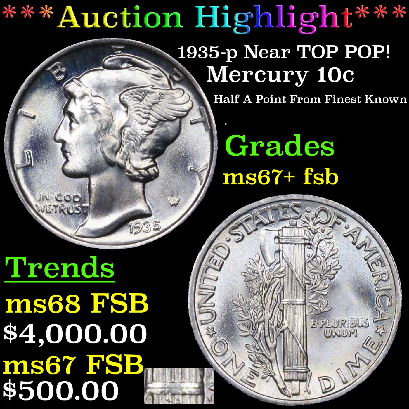 ***Auction Highlight*** 1935-p Mercury Dime Near TOP POP! 10c Graded ms67+ fsb BY SEGS (fc)