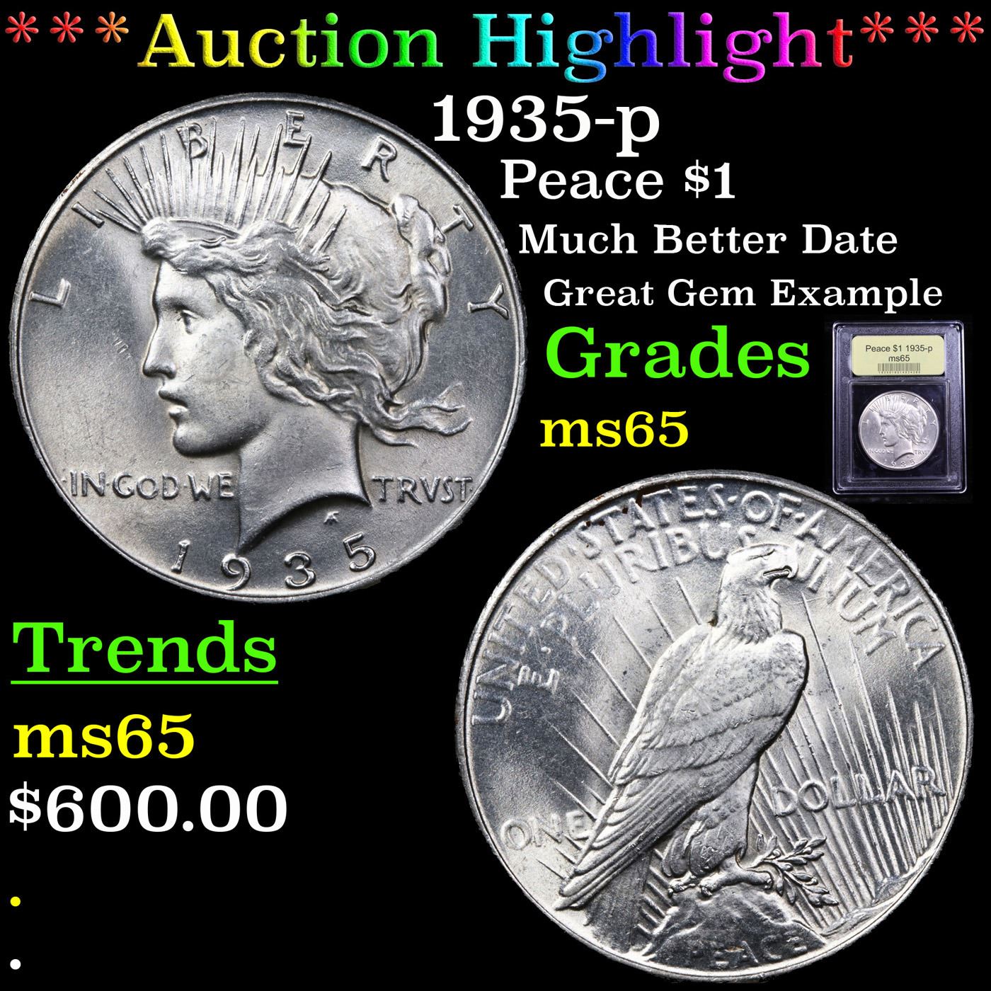 ***Auction Highlight*** 1935-p Peace Dollar $1 Graded GEM Unc By USCG. A Corey's Pick, Bid to Win Coin
