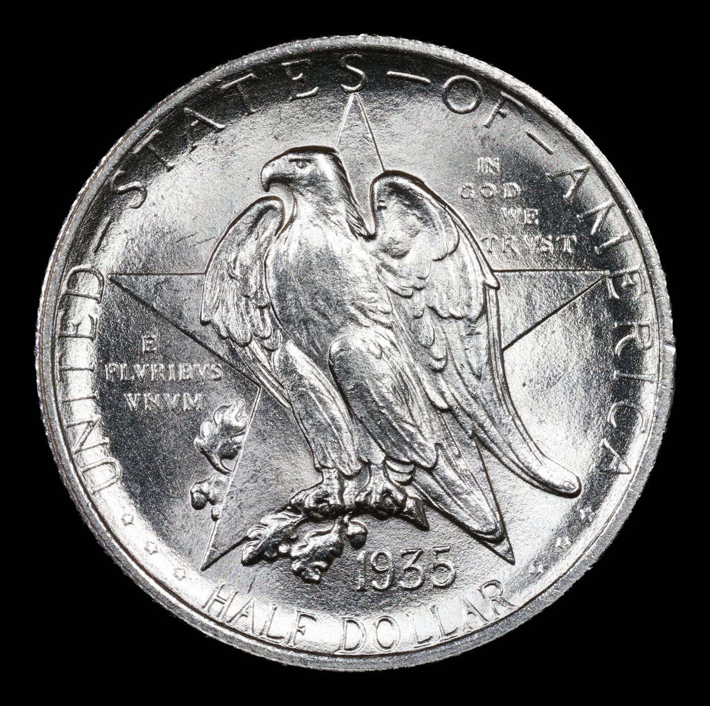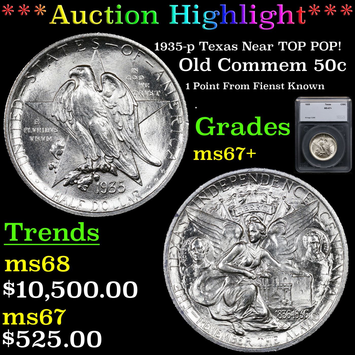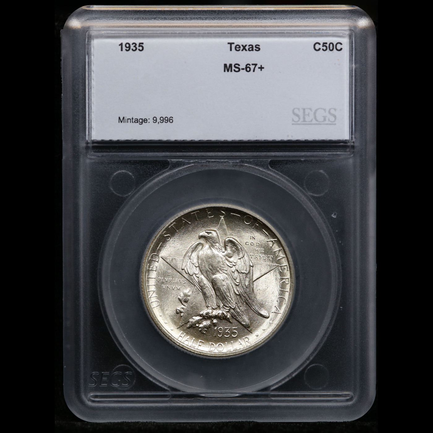 ***Auction Highlight*** 1935-p Texas Near TOP POP! Old Commem Half Dollar 50c Graded ms67+ By SEGS. The Texas Centennial half dollar commemorative coin was minted to honor the Centennial of Texas's independence from Mexico. Early in the administration of President Franklin Delano Roosevelt, on June 15, 1933, Congress passed an act to authorize the coinage of silver half dollars "in commemoration of the one hundredth anniversary in 1936 of the independence of Texas, and of the noble and heroic sacrifices of her pioneers, whose revered memory has been an inspiration to her sons and daughters during the past century." The Texas commemorative series ran from 1934 thru 1938 and 13 different dates and mint mark combinations were issued. For each of the years 1935 thru 1938, coins were struck at all three Mints; Philadelphia, Denver, and San Francisco. But for the 1934 Texas, only Philadelphia Mint coins were issued. The original issue price was $1.00 per coin.The coin was designed by Pompeo Coppini, a Texan. The obverse depicts an Eagle sitting on a branch in front of the Lone Star, the symbol of Texas. The reverse depicts the goddess Victory spreading her wings over the Alamo. It also depicts Sam Houston on her left and Stephen F. Austin on her right. The Six Flags of Texas fly above her head. Under her it reads REMEMBER THE ALAMO. Over Sam Houston, Victory, and Stephen F. Austin it reads THE TEXAS INDEPENDENCE CENTENNIAL.
