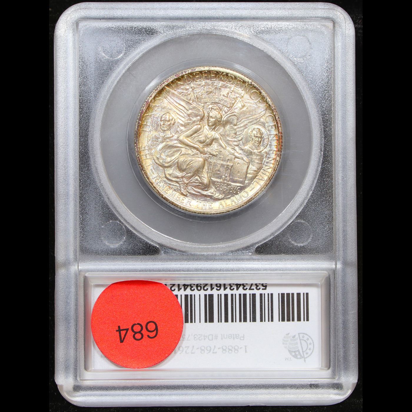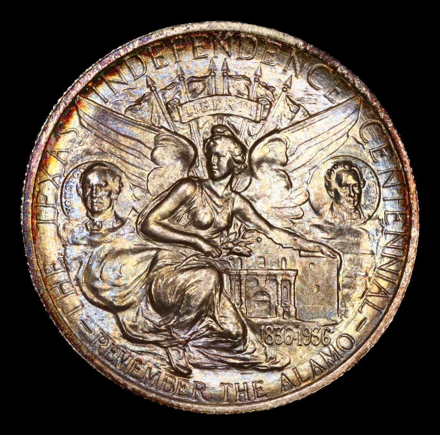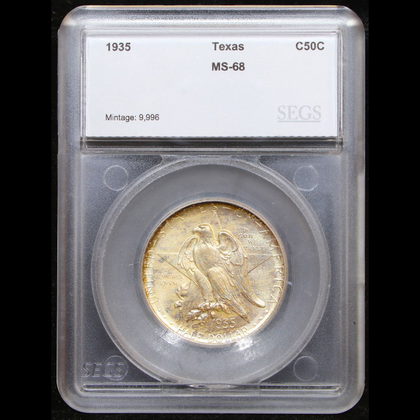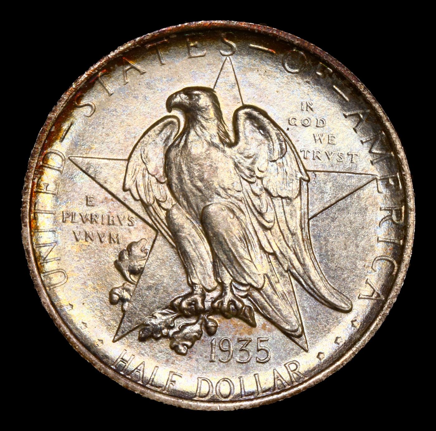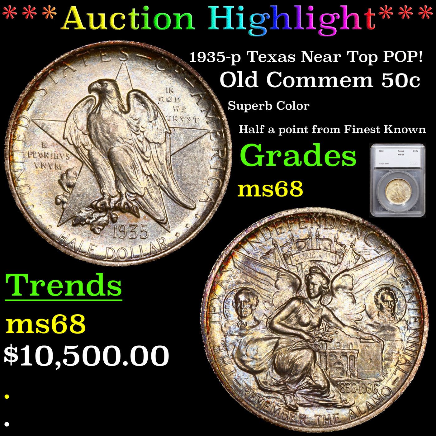 ***Auction Highlight*** 1935-p Texas Near Top POP! Old Commem Half Dollar 50c Graded ms68 By SEGS. The Texas Centennial half dollar commemorative coin was minted to honor the Centennial of Texas's independence from Mexico. Early in the administration of President Franklin Delano Roosevelt, on June 15, 1933, Congress passed an act to authorize the coinage of silver half dollars "in commemoration of the one hundredth anniversary in 1936 of the independence of Texas, and of the noble and heroic sacrifices of her pioneers, whose revered memory has been an inspiration to her sons and daughters during the past century." The Texas commemorative series ran from 1934 thru 1938 and 13 different dates and mint mark combinations were issued. For each of the years 1935 thru 1938, coins were struck at all three Mints; Philadelphia, Denver, and San Francisco. But for the 1934 Texas, only Philadelphia Mint coins were issued. The original issue price was $1.00 per coin.The coin was designed by Pompeo Coppini, a Texan. The obverse depicts an Eagle sitting on a branch in front of the Lone Star, the symbol of Texas. The reverse depicts the goddess Victory spreading her wings over the Alamo. It also depicts Sam Houston on her left and Stephen F. Austin on her right. The Six Flags of Texas fly above her head. Under her it reads REMEMBER THE ALAMO. Over Sam Houston, Victory, and Stephen F. Austin it reads THE TEXAS INDEPENDENCE CENTENNIAL.
