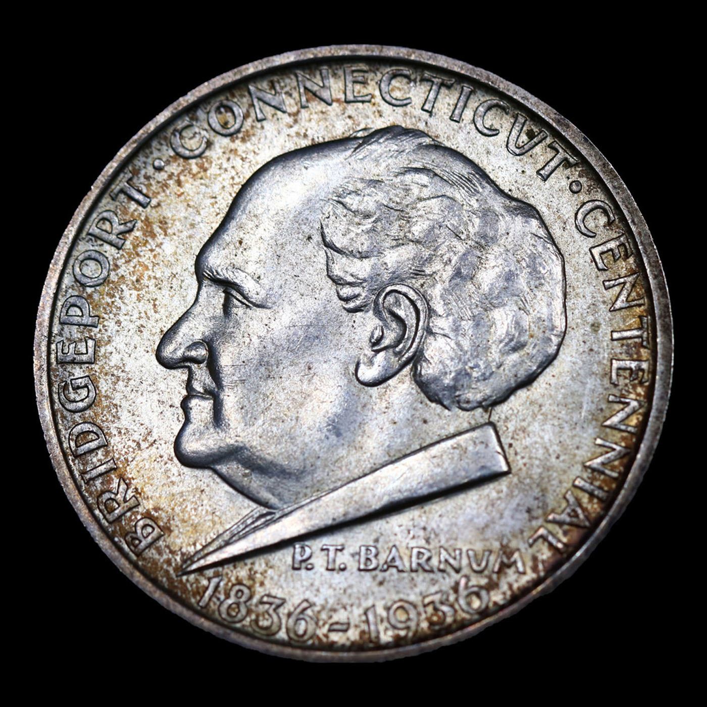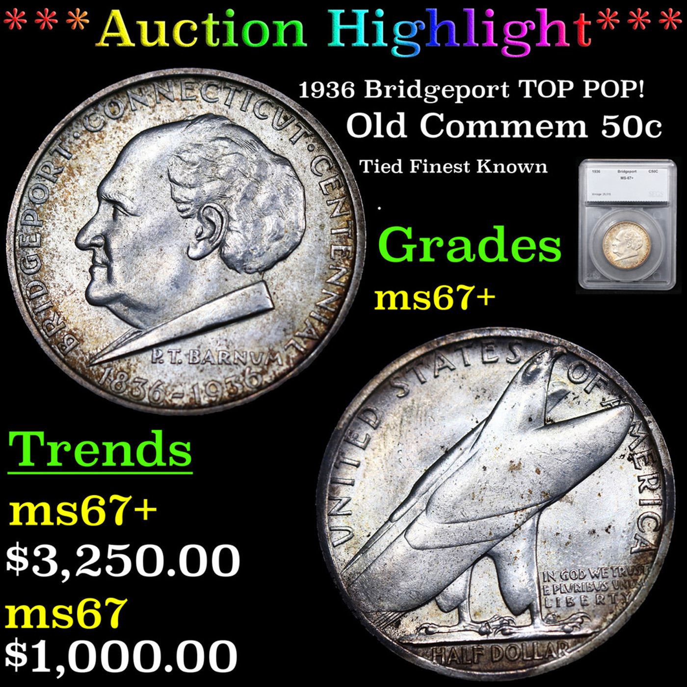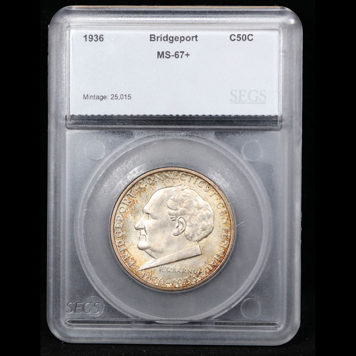 ***Auction Highlight*** 1936 Bridgeport TOP POP! Old Commem Half Dollar 50c Graded ms67+ By SEGS. The Bridgeport Commemorative bears the depiction of P.T. Barnum on the Obverse, having made his home in Bridgeport. Barnum was the Mayor of Bridgeport during his life. The city of Bridgeport created this coin to celebrate its centennial, but The city had actually been around since the 1600's as a major manufacturing and port city, but it was not officially incorporated until 1836. An odd Commemorative to say the least. When examining a Bridgeport, the first place to look for wear is Barnum’s cheek and the eagle’s wing. A Corey's Pick, Bid to Win, Don't let it get Away Coin