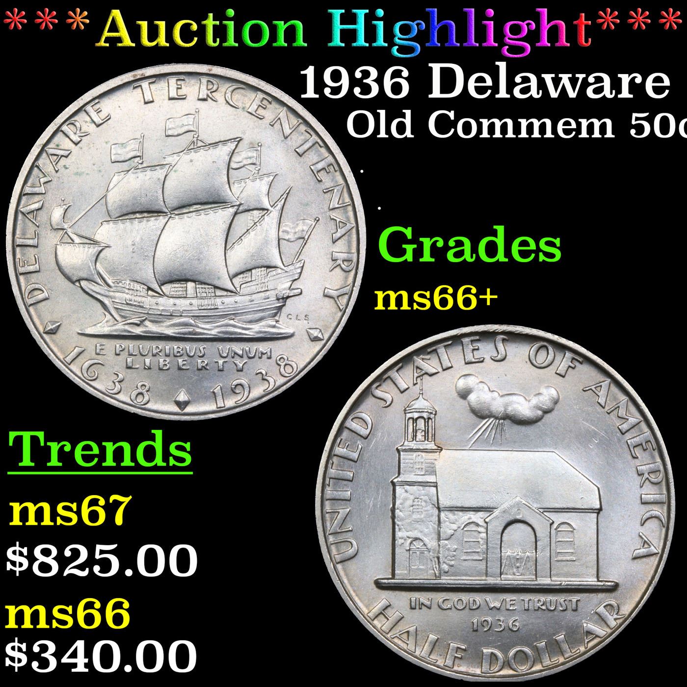 ***Auction Highlight*** 1936 Delaware Old Commem Half Dollar 50c Grades GEM++ Unc By SEGS. A commemorative coin was approved to mark the occasion of the 300th anniversary of the landing of the Swedes in Delaware. Known as the Delaware Tercentenary Half Dollar, this issue is associated with a confusing array of dates. The date on the obverse is 1936, the coins were struck in 1937, and the anniversary date on the reverse is 1938.The designs for the coin were selected through a competition judged by United States Mint Chief Engraver John R. Sinnock and sculptor Robert Tait MacKenzie. The winning entry was submitted by Carl L. Schmitz.The obverse of the Delaware Half Dollar features an image of the Old Swedes Church, which was dedicated in 1699. The reverse depicts the ship Kalmar Nyckel, which brought Swedish settlers to the country. Due to the arrangement of the inscriptions there was some confusion about which side of the coin was the obverse and which was the reverse. Official mint records indicate the side bearing the image of the Old Swedes Church as the obverse.The 1936 Delaware Half Dollars were distributed by the Delaware Swedish Tercentenary Commission for $1.75 each. A minimum production of 25,000 pieces was specified under the authorizing legislation. This entire number was struck at the Philadelphia Mint. Eventually, 4,022 unsold pieces were returned to the mint for melting.When examining a Delaware note that most pieces are not fully struck in their centers. Potential weak spots include the lower mainsail (at the coin’s center) and the gable above the arched doorway. to Determine actual wear Look on the lower mainsail and on the gable above the doorway arch. A Corey's Pick, Bid to Win Coin