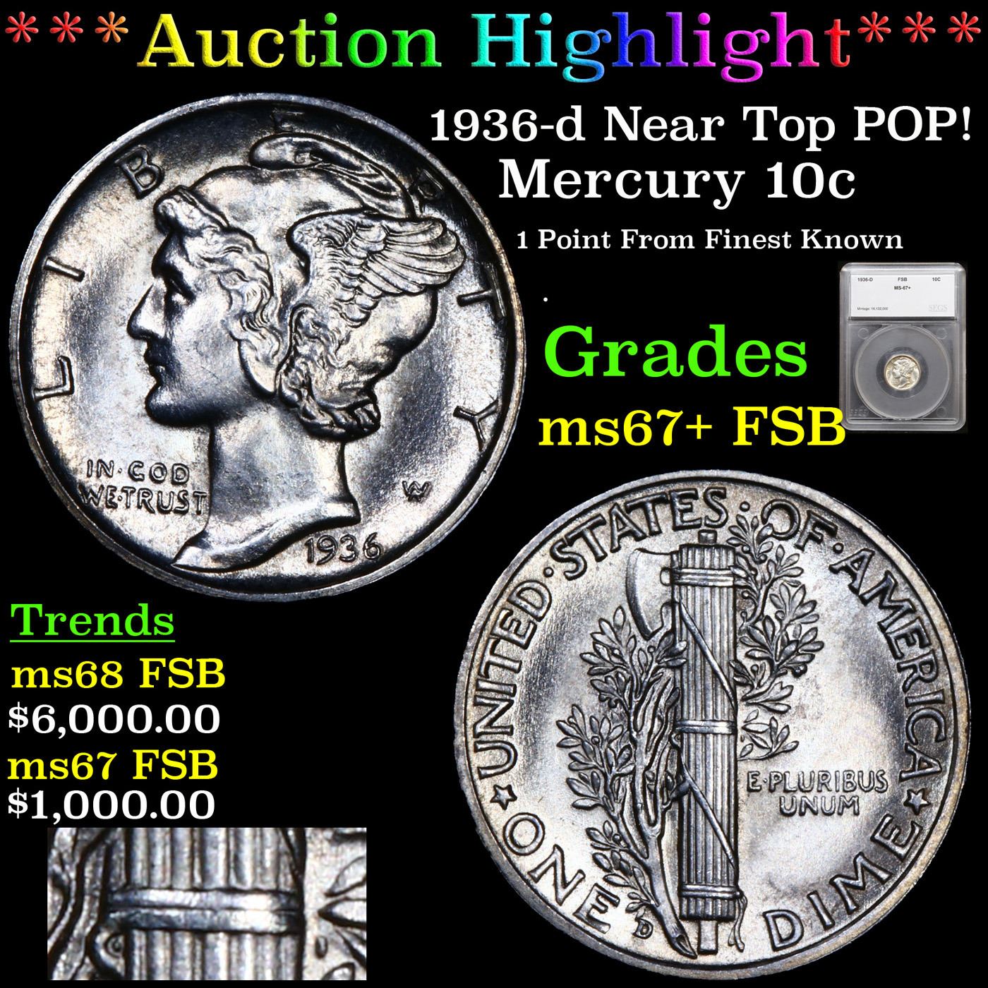 ***Auction Highlight*** 1936-d Near Top POP! Mercury Dime 10c Graded ms67+ FSB By SEGS.