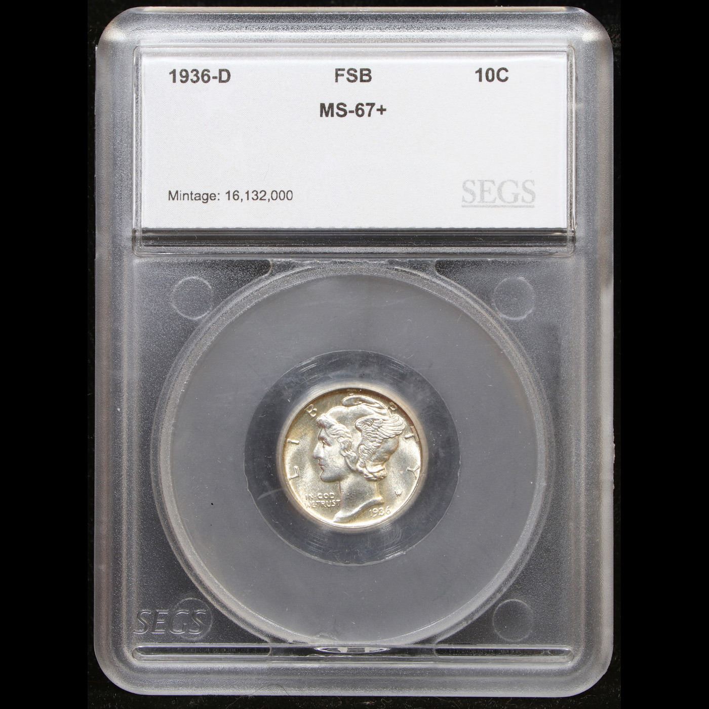 ***Auction Highlight*** 1936-d Mercury Dime Near Top POP! 10c Graded ms67+ FSB By SEGS (fc)
