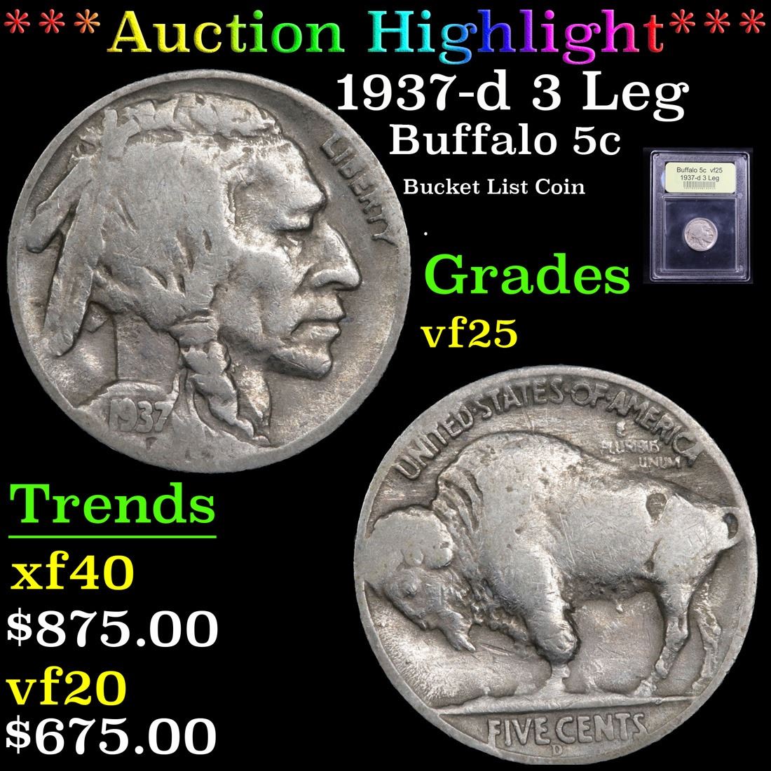 ***Auction Highlight*** 1937-d 3 Leg Bucket List Coin . Buffalo Nickel 5c Graded vf+ By USCG.  The most sought after and heralded Buffalo, the 3 legged 1937-d.       A Corey's Pick, Bid to Win, Don't let it get Away, you might not find its equal Coin