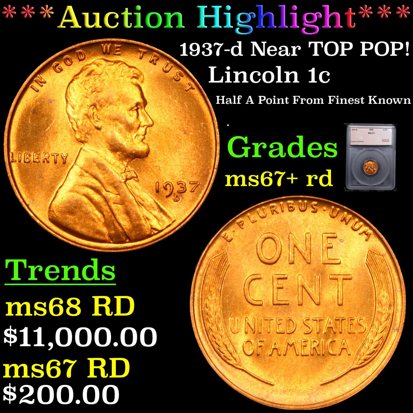 ***Auction Highlight*** 1937-d Near TOP POP! Lincoln Cent 1c Graded ms67+ rd BY SEGS. A Key Date's Pick, Bid to Win Coin