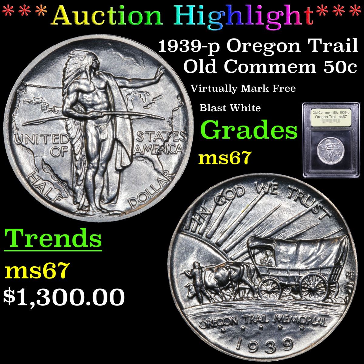 ***Auction Highlight*** 1939-p Oregon Trail Old Commem Half Dollar 50c Graded GEM++ Unc BY USCG. Up for Auction is a stunning and scarce 1939 Oregon Trail. Blazing Luster, virtually mark free and Blast White. The 1939 Oregon's were the last of the Oregon series, which ran from 1926 thru 1939, the longest U.S. silver commemorative series. At $7.50 per set, the 1939 Oregon's had the highest issue price of any of the Oregon's. They also had the lowest mintage, 3004 coins for each of the 1939 and 1939-D and 3005 coins for the 1939-S. A Corey's Pick, Bid to Win, Don't let it get Away, you might not find its equal Coin