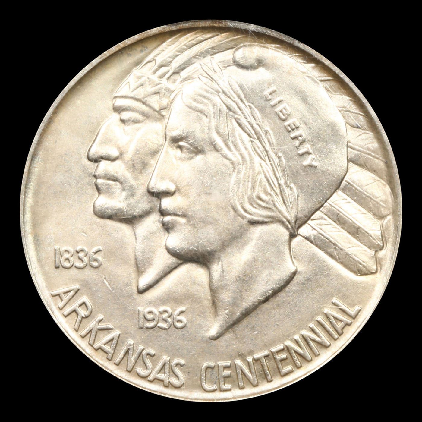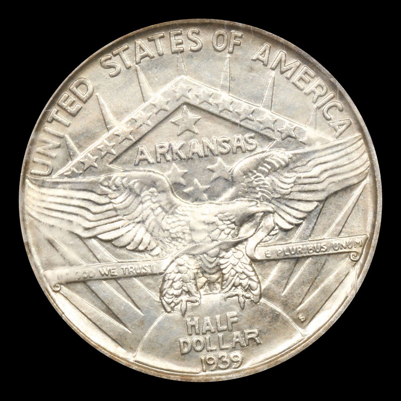 ***Auction Highlight*** 1939-s Arkansas Near TOP POP! Old Commem Half Dollar 50c Graded ms67 BY SEGS. Commemorative coins were authorized to celebrate the 100th anniversary of the admission of Arkansas into the Union. The Arkansas Centennial Half Dollars ended up being issued during five separate years, across three different mints. The coins became controversial due to the stream of variations created specifically to market to collectors, as well as the escalating issue prices as mintage for later issues became smaller.