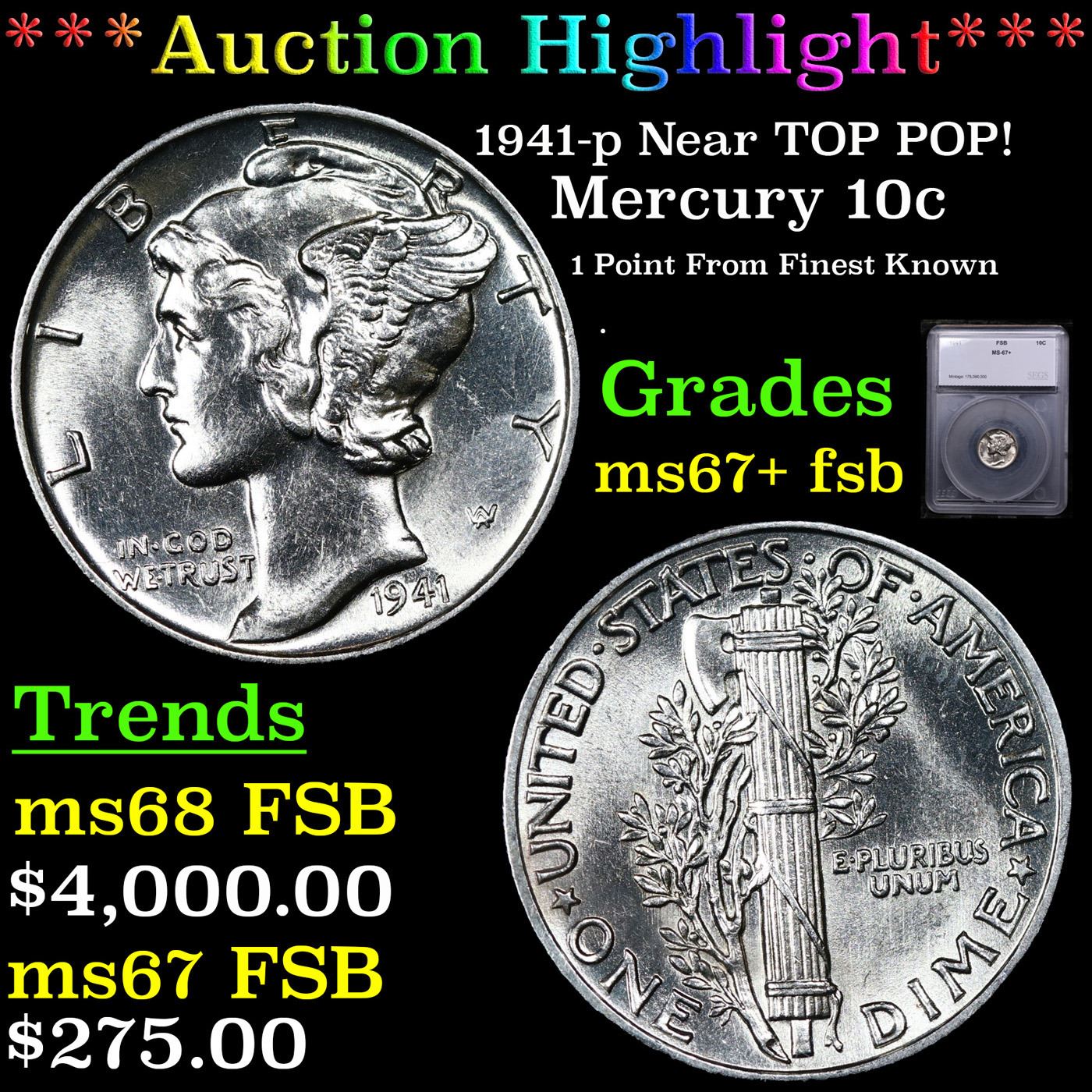 ***Auction Highlight*** 1941-p Mercury Dime Near TOP POP! 10c Graded ms67+ fsb BY SEGS (fc)