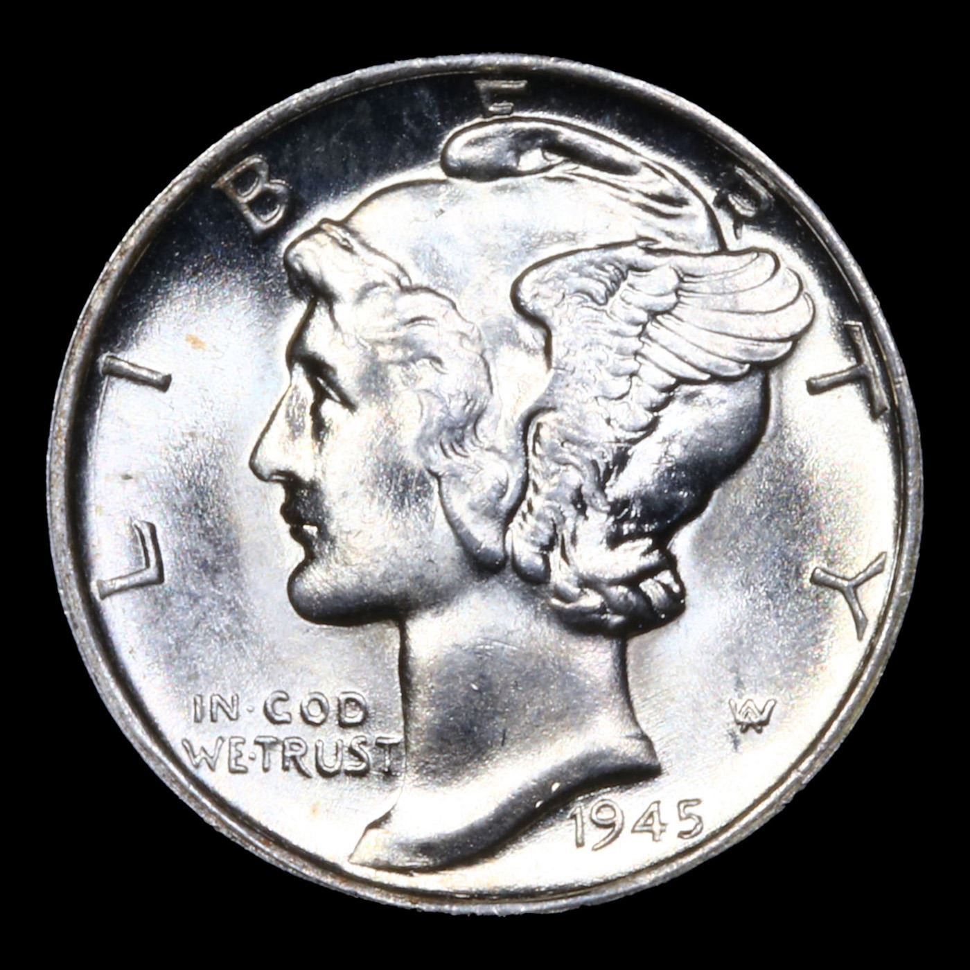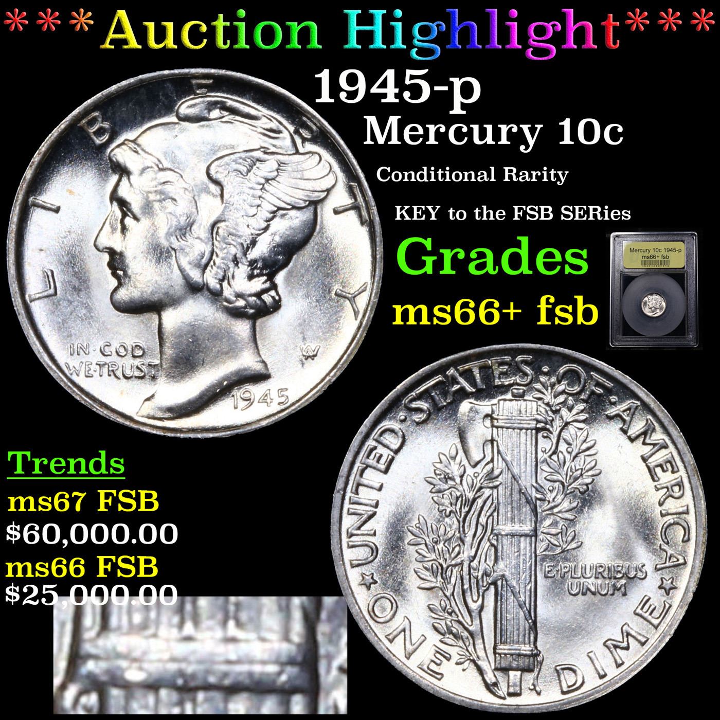 ***Auction Highlight*** 1945-p Mercury Dime 10c Graded GEM++ FSB BY USCG. The 1945 is one of the prime strike rarities not only in the Mercury dime series, but also in the entire historical U.S. coinage family. With a staggering mintage of 159,130,000 pieces -- one of the highest for this type -- it should come as no surprise to read that this issue is very common in an absolute sense. This even includes Mint State survivors without a Full Bands designation. In all grades within the Full Bands category, however, the 1945 is a major rarity. David W. Lange offers two theories to explain why virtually the entire mintage of this issue emerged from the dies with poor central definition on the reverse. The first is slight difference in the diameter of the collar used in striking, and the second is slight difference in the curvature of the rims as imparted by the upsetting mill. In both cases the pattern and quality of strike of the finished coins could have been adversely affected by these differences, even if subtle. Regardless, the rarity of the 1945 with Full Bands definition is legendary, and the acquisition of such an example, especially a Gem Mint State coin, has long been regarded as the crowning achievement of the most advanced Mercury dime collectors. A Key Date's Pick, Bid to Win, Don't let it get Away, you might not find its equal Coin. I give this coin my highest recommendation