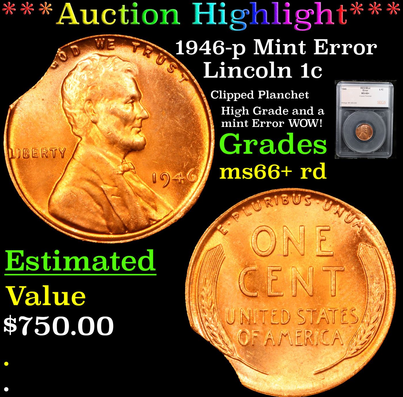 ***Auction Highlight*** 1946-p Lincoln Cent Mint Error 1c Graded ms66+ rd By SEGS (fc)