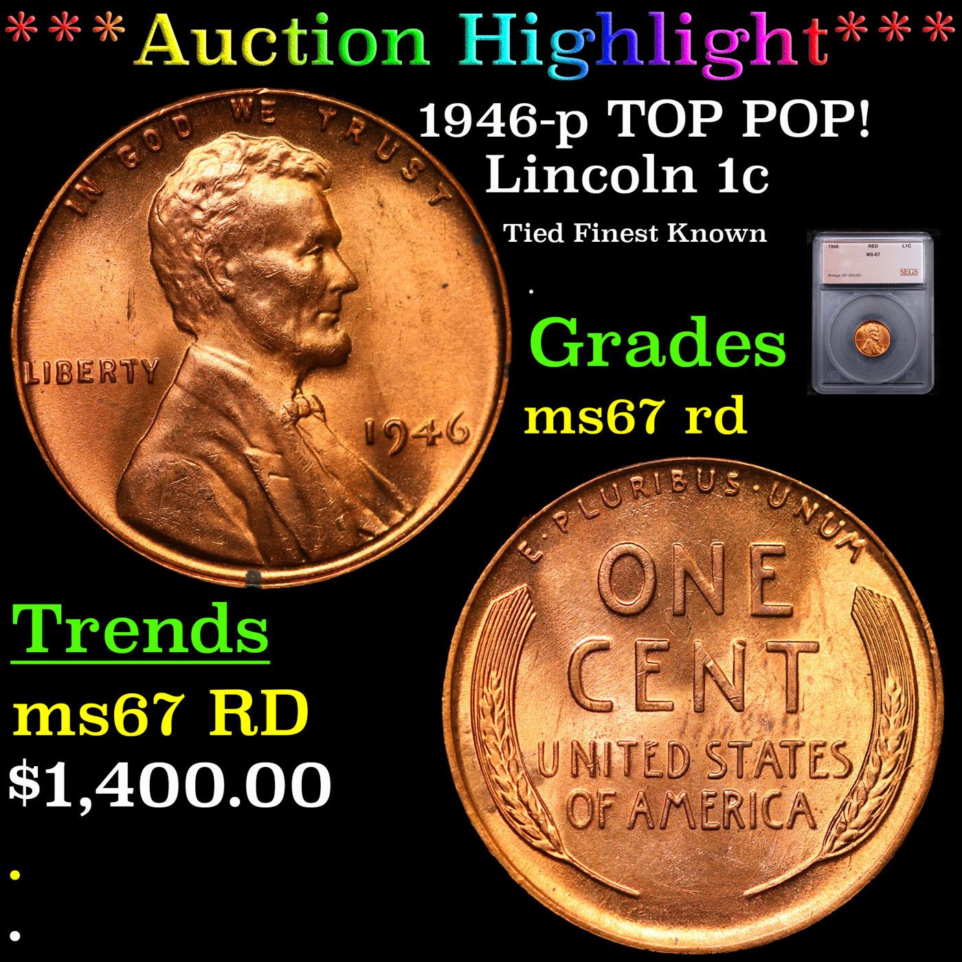 ***Auction Highlight*** 1946-p TOP POP! Lincoln Cent 1c Graded ms67 rd BY SEGS.