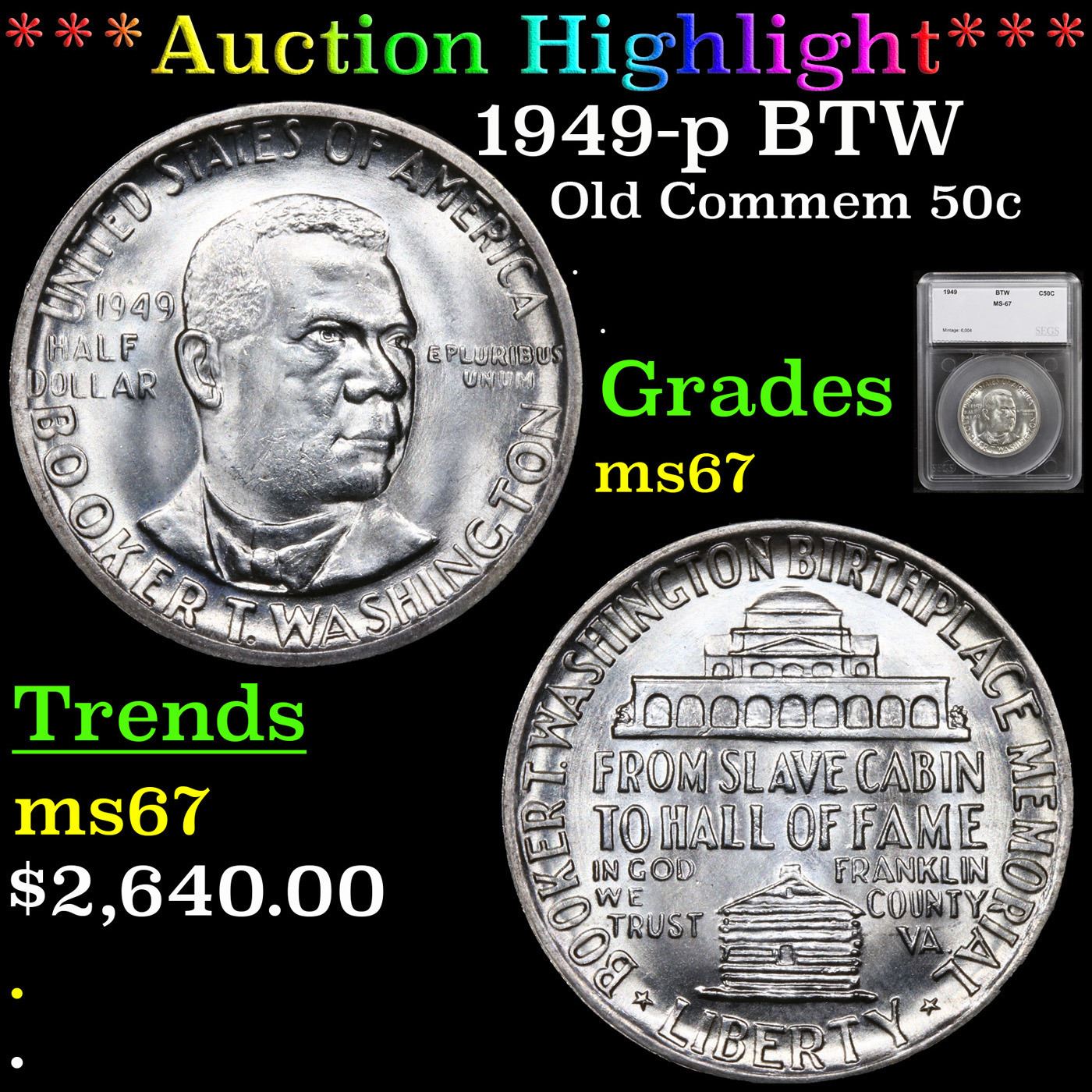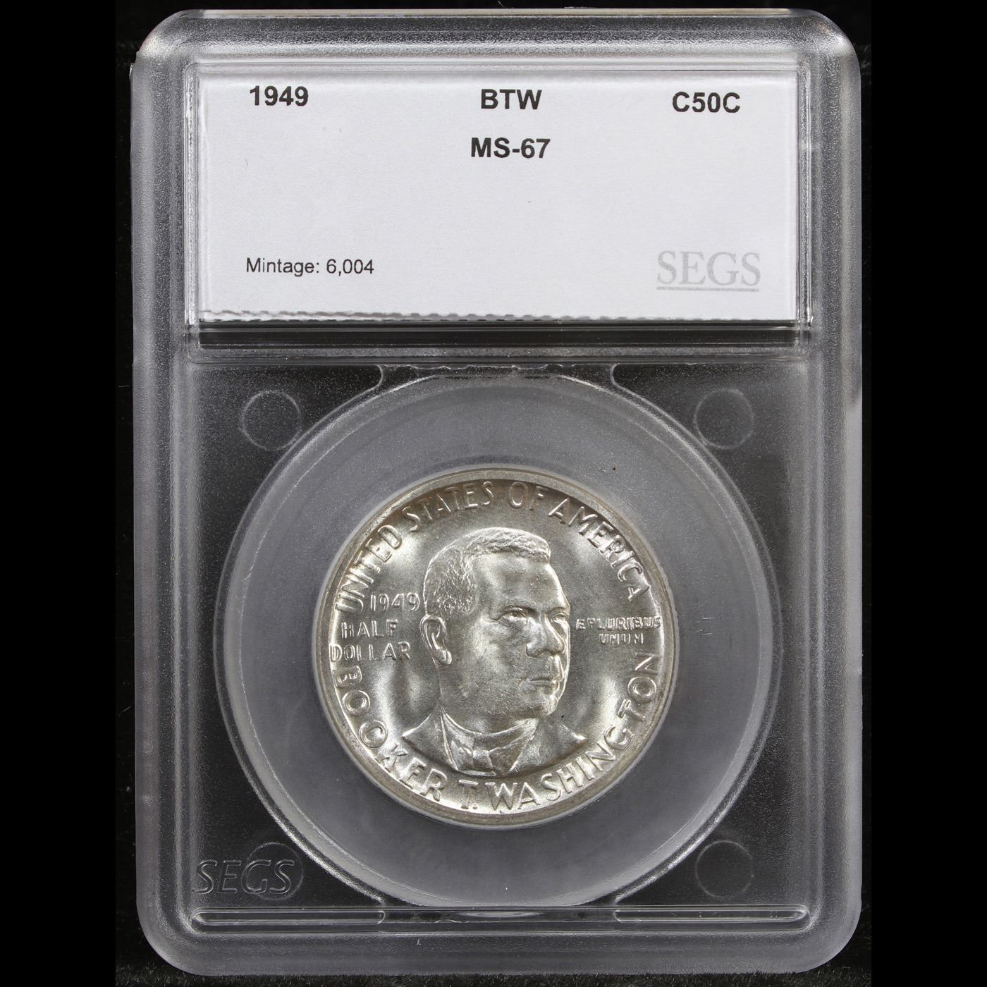 ***Auction Highlight*** 1949-p BTW Old Commem Half Dollar 50c Graded ms67 By SEGS. When examining a Booker T. Washington commemorative look for wear on the high points, on the obverse that is Mr. Washington's right Cheek (from his perspective), and on the reverse the arches on the top building.