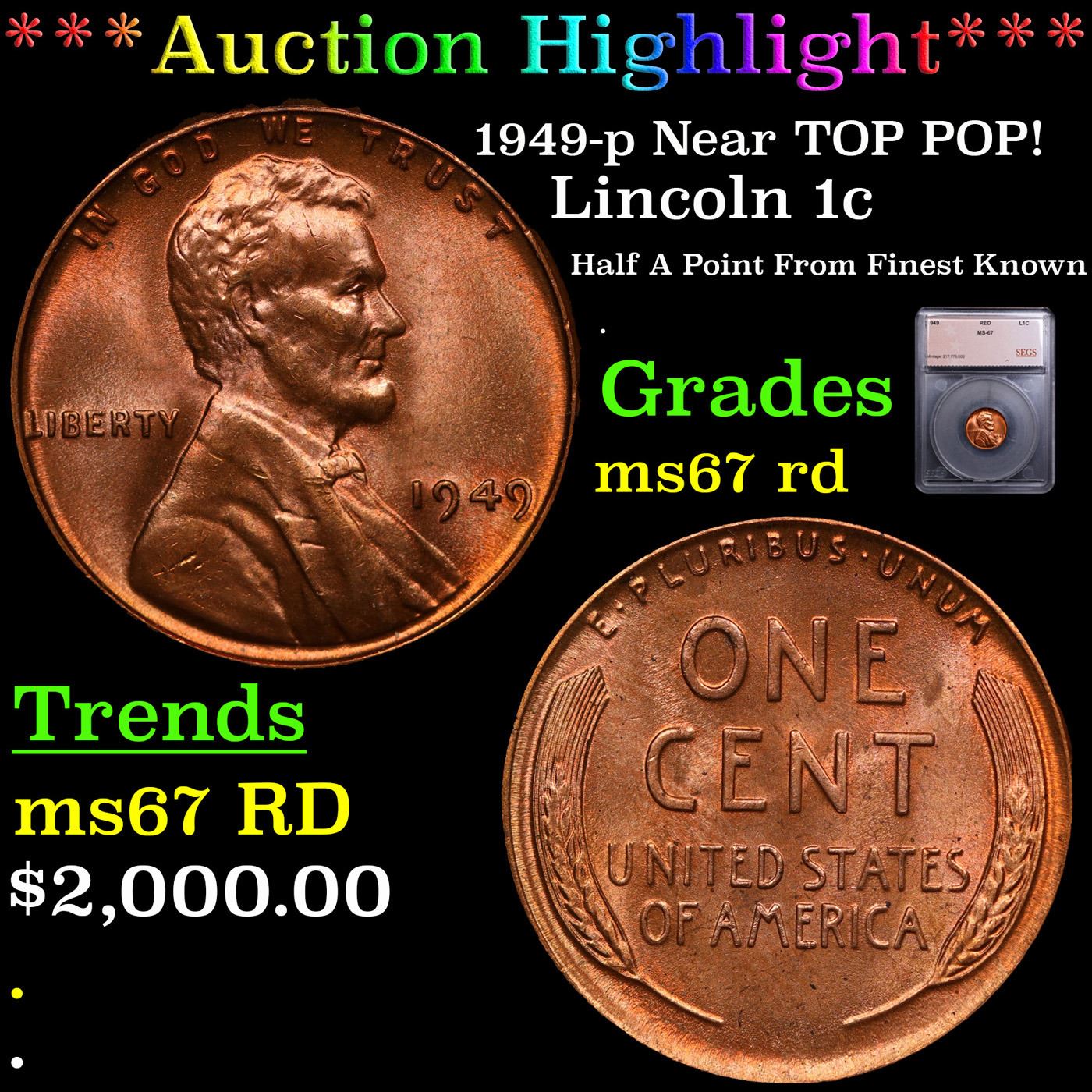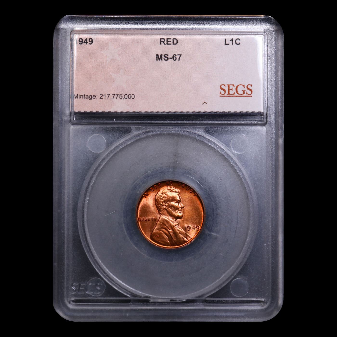 ***Auction Highlight*** 1949-p Near TOP POP! Lincoln Cent 1c Graded ms67 rd BY SEGS. A Corey's Pick, Bid to Win, Don't let it get Away Coin