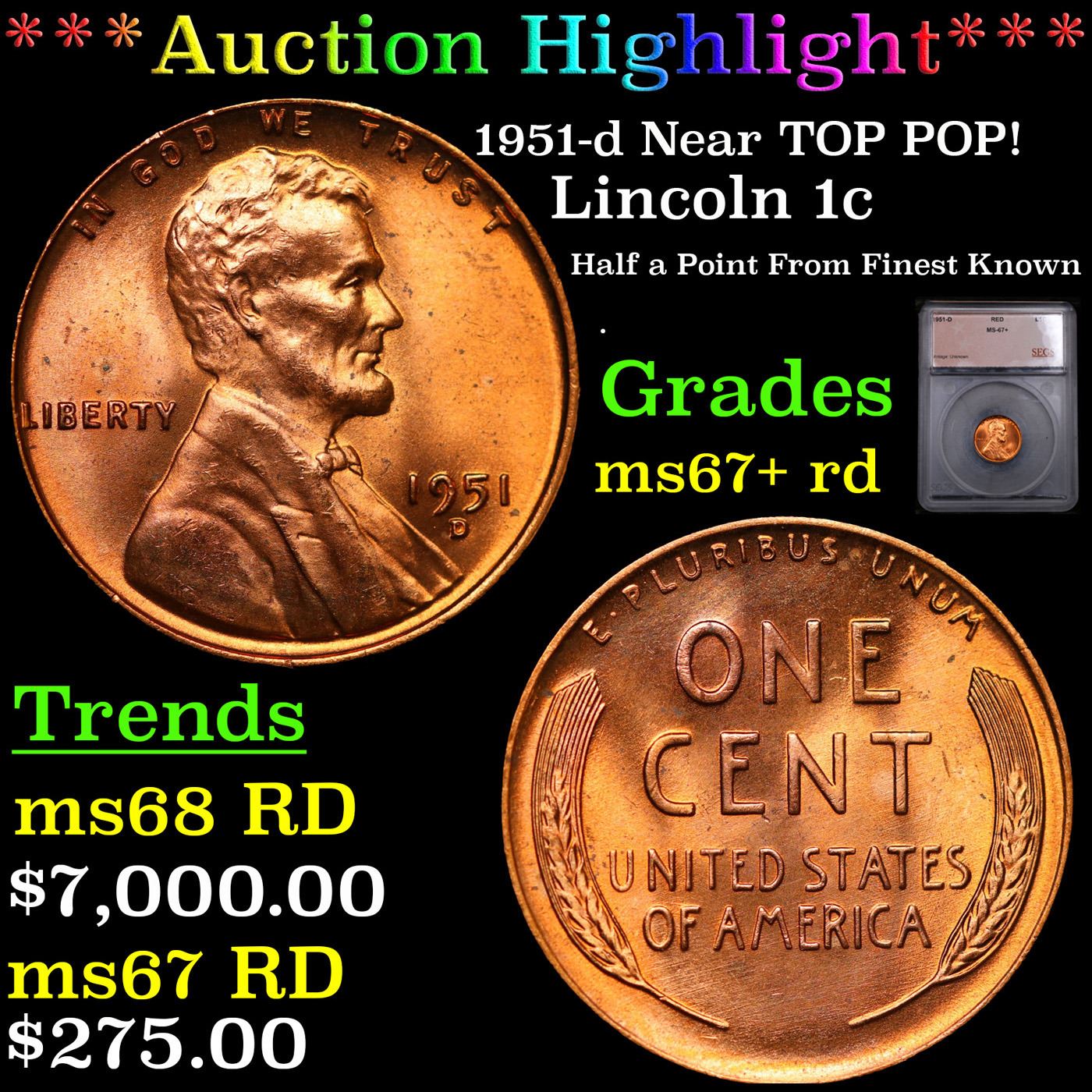 ***Auction Highlight*** 1951-d Near TOP POP! Lincoln Cent 1c Graded ms67+ rd BY SEGS. A Corey's Pick, Bid to Win, Don't let it get Away Coin