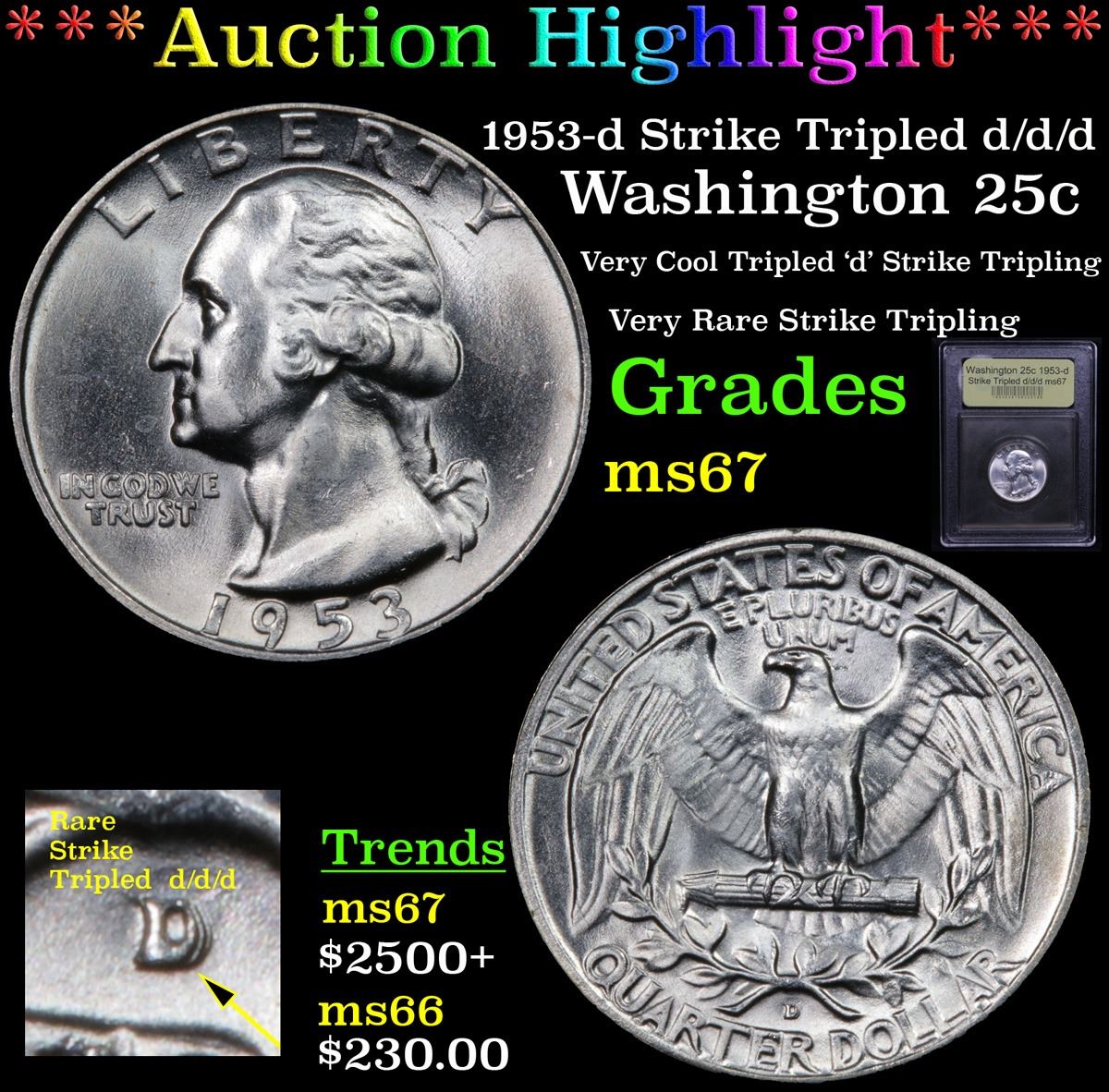 ***Auction Highlight*** 1953-d Strike Tripled d/d/d Washington Quarter 25c Graded GEM++ Unc BY USCG