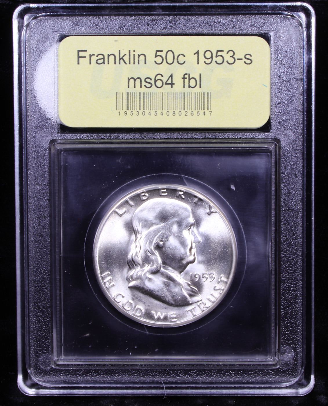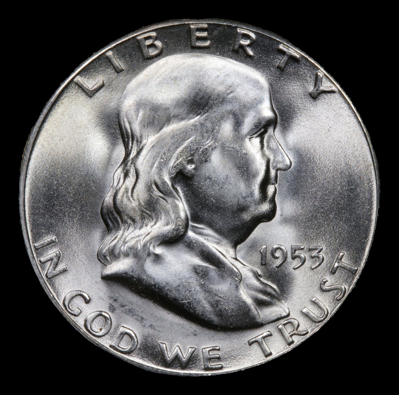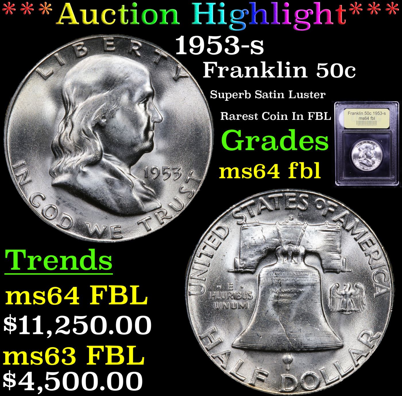 ***Auction Highlight*** 1953-s Franklin Half Dollar 50c Graded Choice Unc FBL By USCG. The 1953-S is a challenging Franklin half dollar to acquire with Full Bell Lines definition. Less than 50 coins with that designation, including some possible duplication exist. Given the scarcity of Full Bell Lines coins, just about any example -- regardless of grade -- are highly sought. This choice is satiny and frosty. The bell's lower edge is slightly soft, but the lines are visibly complete across. Neither side has individually significant abrasions A Corey's Pick, Bid to Win, Don't let it get Away, you might not find its equal Coin. I give this coin my highest recommendation