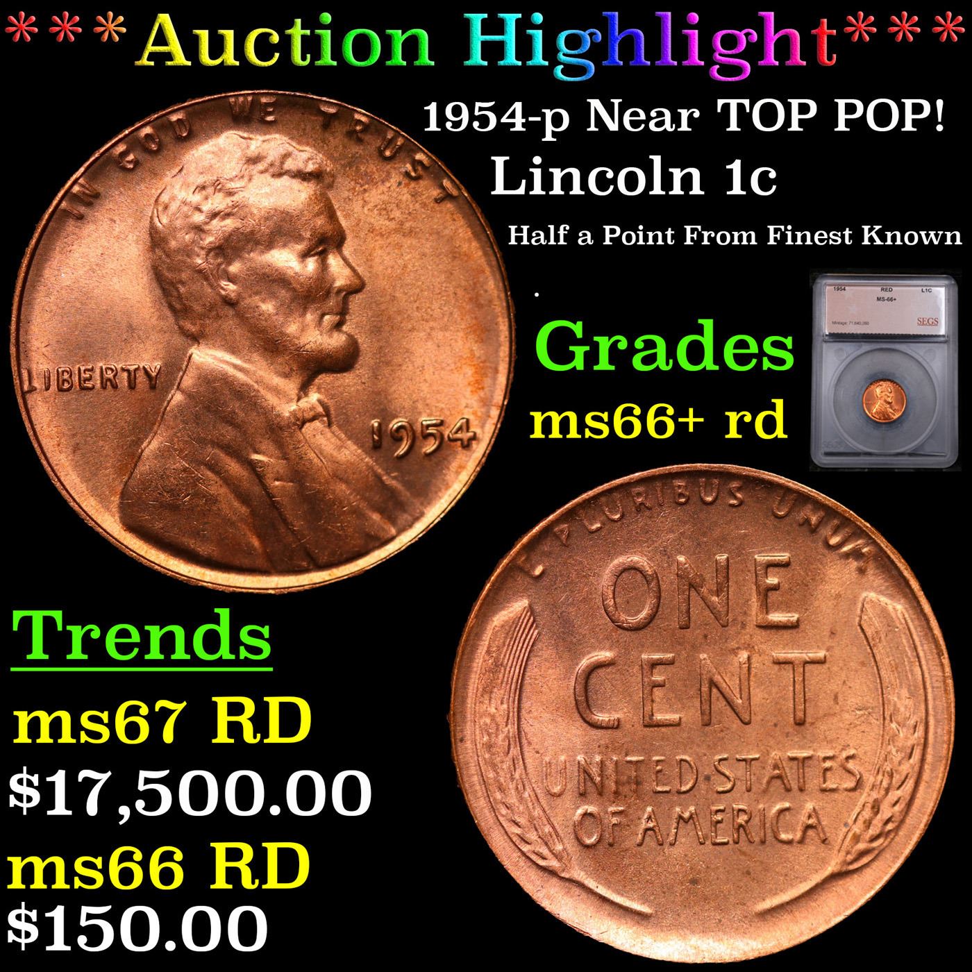 ***Auction Highlight*** 1954-p Lincoln Cent Near TOP POP! 1c Graded ms66+ rd BY SEGS (fc)