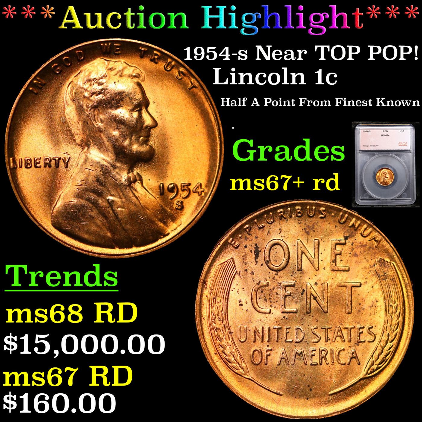 ***Auction Highlight*** 1954-s Lincoln Cent Near TOP POP! 1c Graded ms67+ rd BY SEGS (fc)