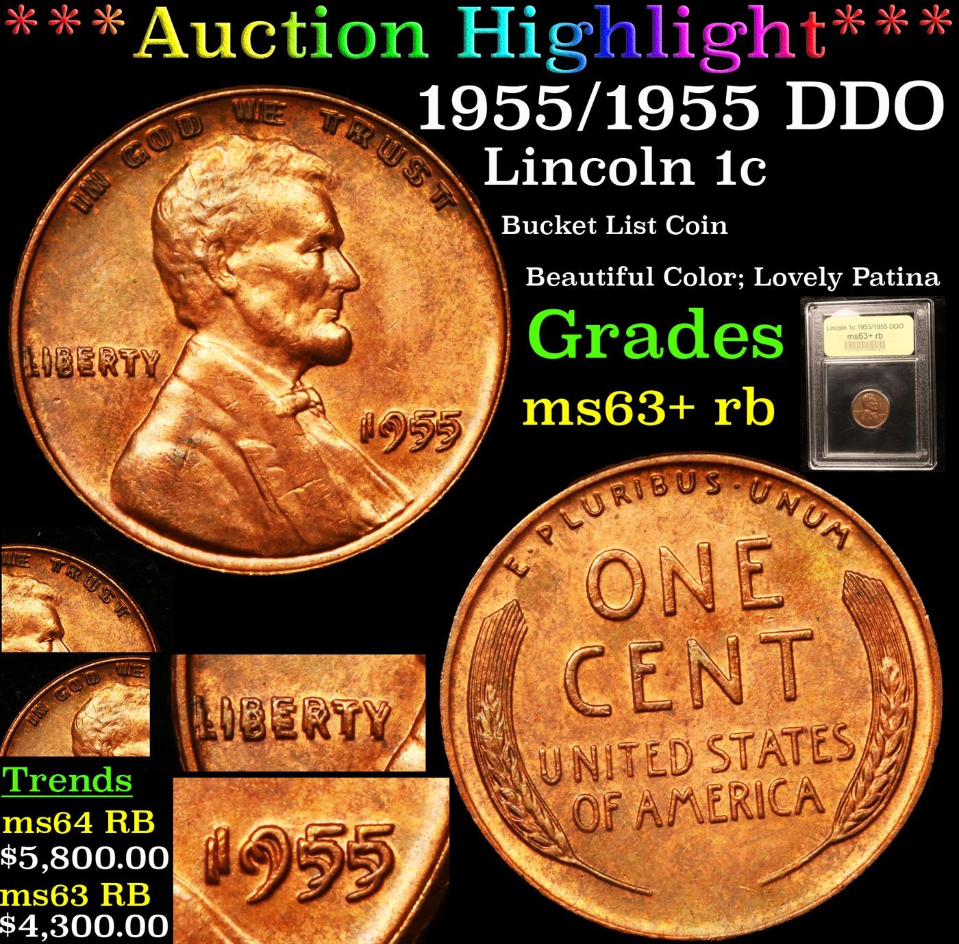***Auction Highlight*** 1955/1955 DDO Lincoln Cent 1c Graded Select+ Unc RB BY USCG. A lovely array of copper-orange, red, violet, burgundy, and olive hues adorns each side of this choice Red and Brown coin, with no significant abrasions present. Luster is satiny and luminous, and strike sharpness is pleasing. This is the most famous Lincoln cent variety, and it is one of the most important doubled dies in 20th century coinage. A Corey's Pick, Bid to Win, Don't let it get Away, you might not find its equal Coin. I give this coin my highest recommendation