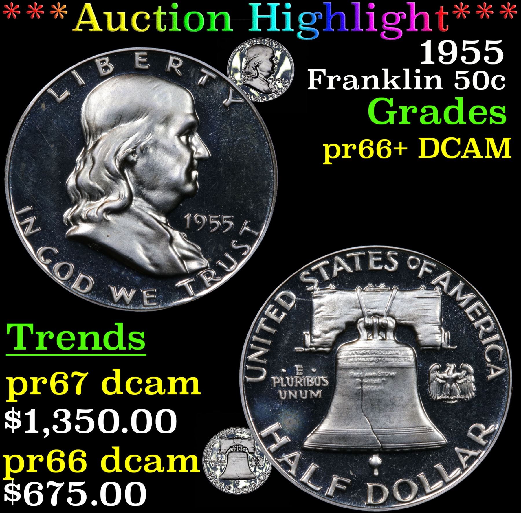 ***Auction Highlight*** 1955 Franklin Half Dollar 50c Graded GEM++ Proof Deep Cameo By USCG. A Corey's Pick, Bid to Win Coin