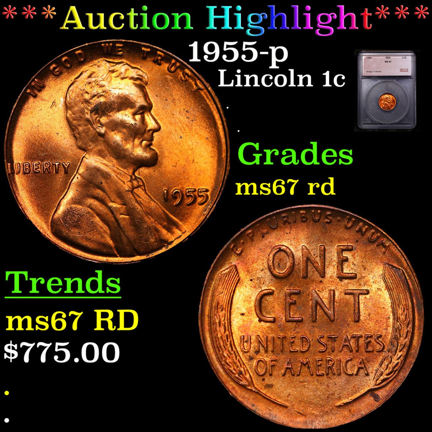 ***Auction Highlight*** 1955-p Lincoln Cent 1c Graded ms67 rd By SEGS. A Corey's Pick, Bid to Win, Don't let it get Away, you might not find its equal Coin. I give this coin my highest recommendation