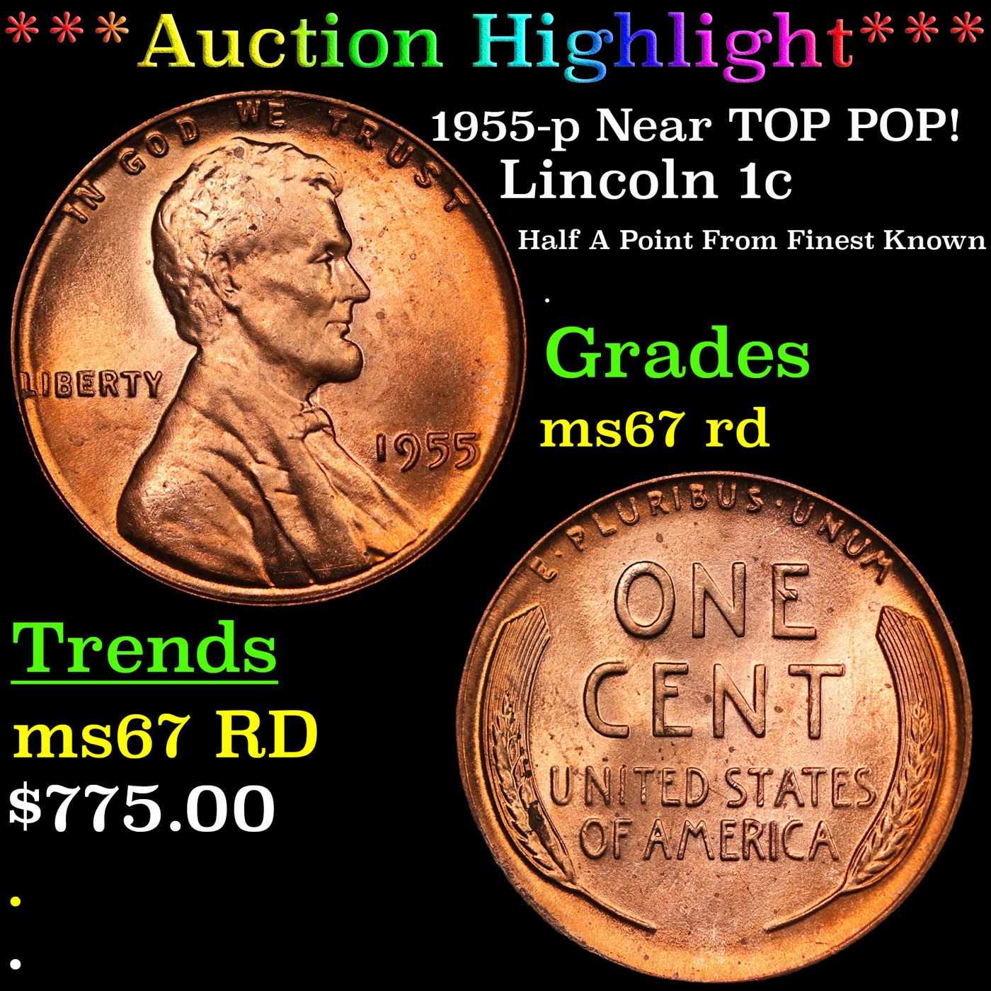 ***Auction Highlight*** 1955-p Lincoln Cent Near TOP POP! 1c Graded ms67 rd By SEGS (fc)