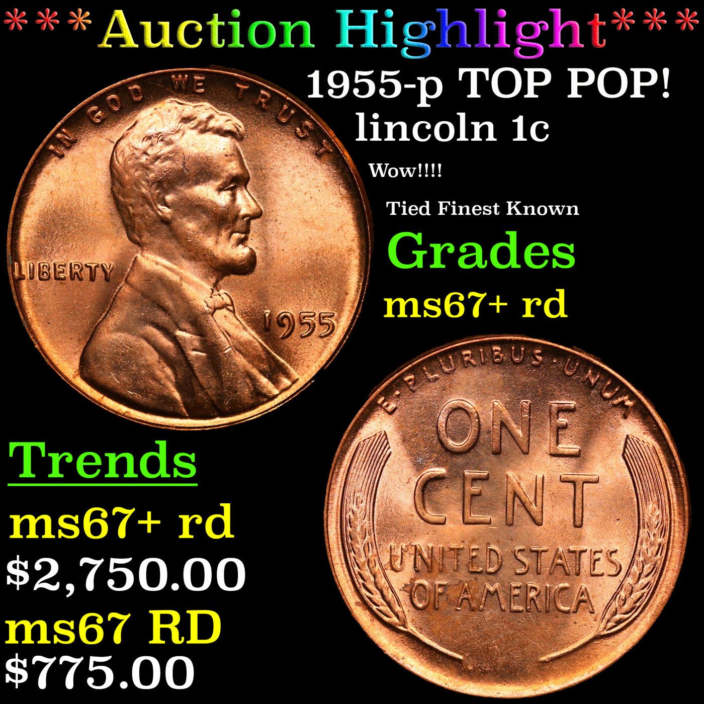 ***Auction Highlight*** 1955-p TOP POP! Lincoln Cent 1c Graded ms67+ rd BY SEGS. A Corey's Pick, Bid to Win, Don't let it get Away, you might not find its equal Coin. I give this coin my highest recommendation