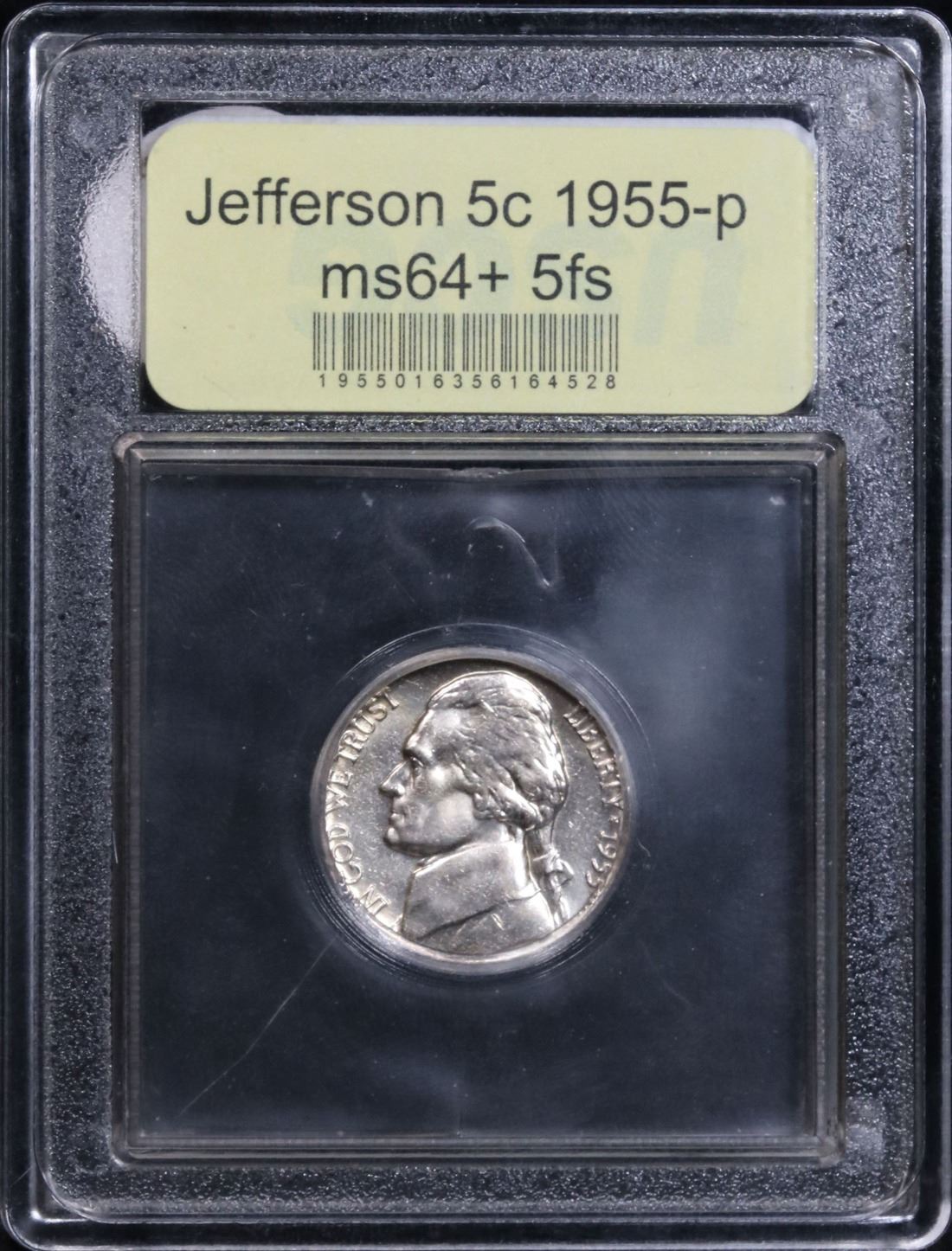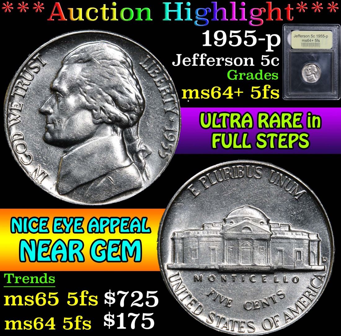 ***Auction Highlight*** 1955-p Ultra rare in full steps . Jefferson Nickel 5c Graded Choice Unc+ 5fs By USCG.