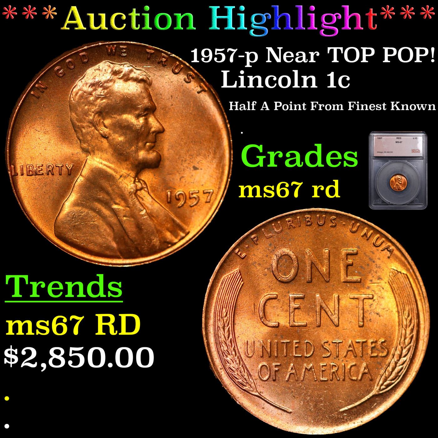 ***Auction Highlight*** 1957-p Lincoln Cent Near TOP POP! 1c Graded ms67 rd BY SEGS (fc)
