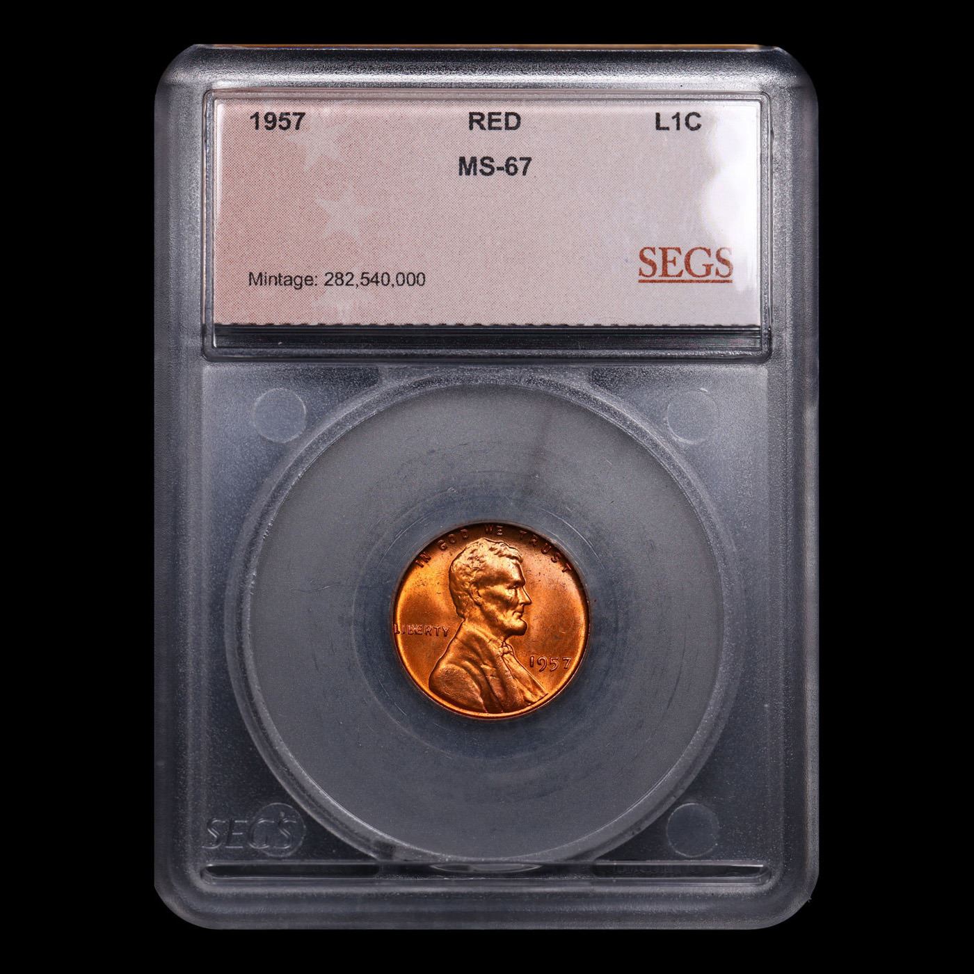 ***Auction Highlight*** 1957-p Near TOP POP! Lincoln Cent 1c Graded ms67 rd BY SEGS. A Corey's Pick, Bid to Win, Don't let it get Away Coin