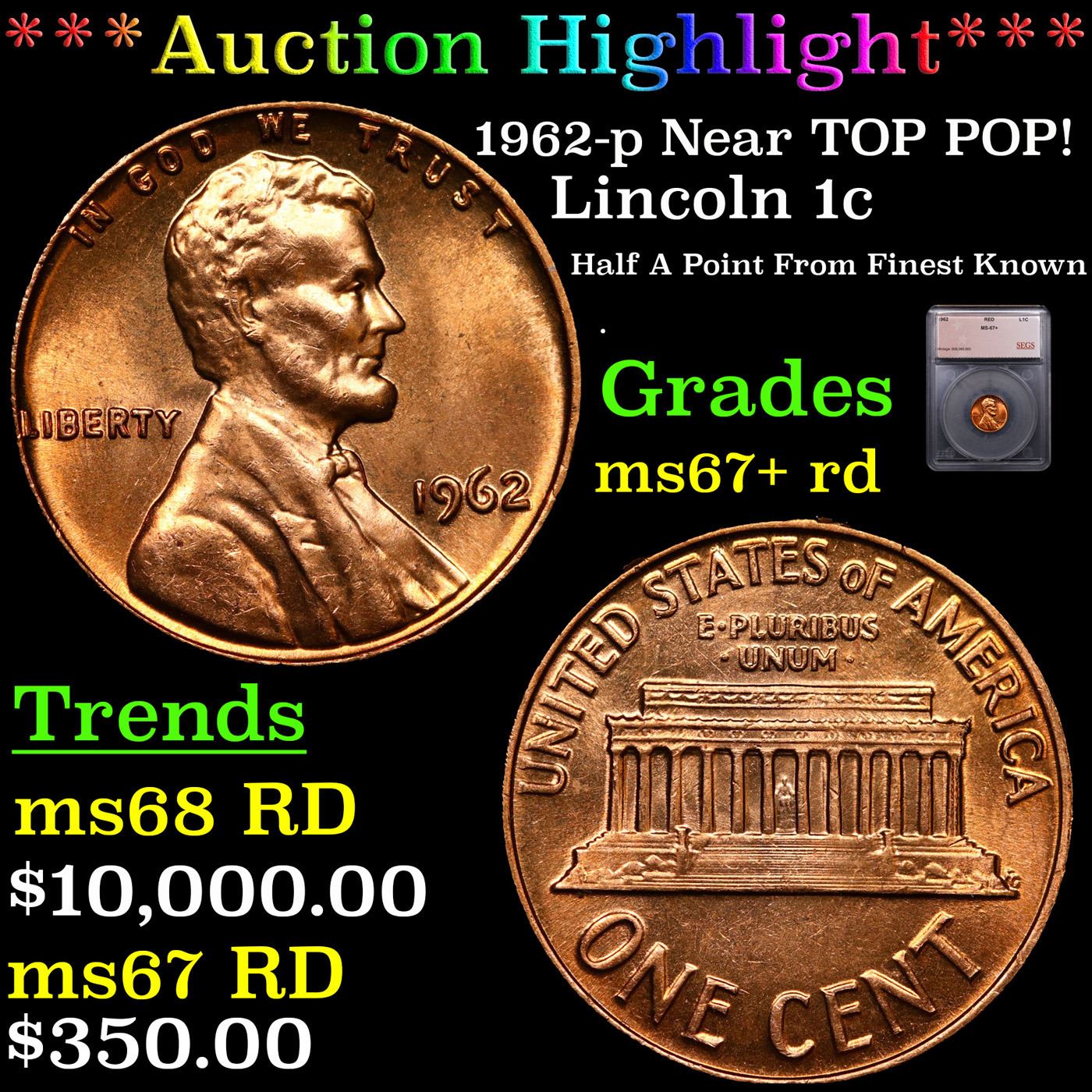 ***Auction Highlight*** 1962-p Near TOP POP! Lincoln Cent 1c Graded ms67+ rd BY SEGS.