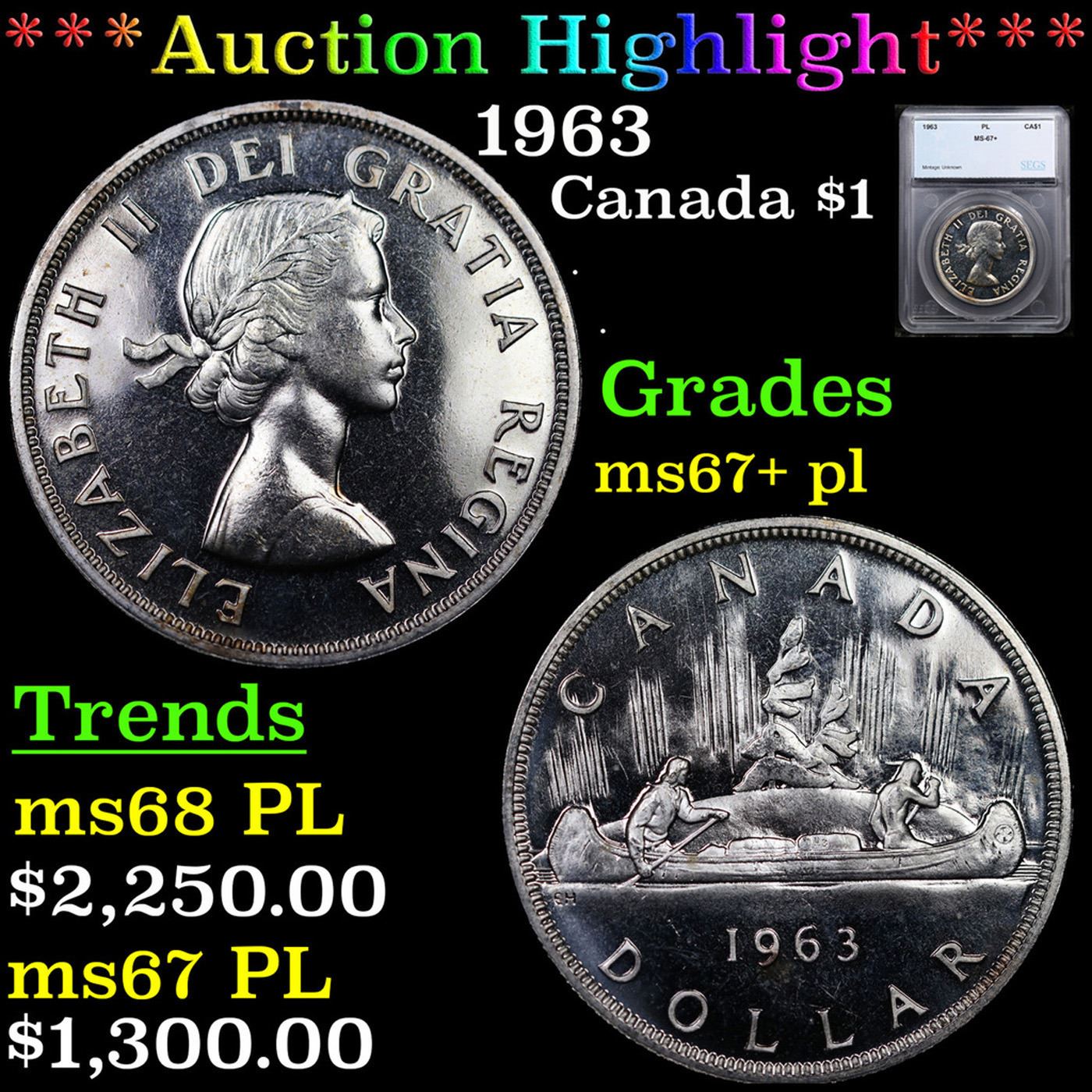 ***Auction Highlight*** 1963 Canada Dollar $1 Graded ms67+ PL By SEGS.