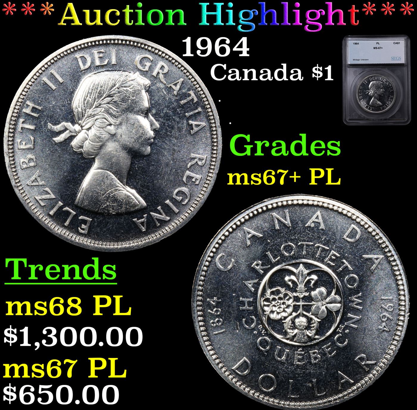 ***Auction Highlight*** 1964 Canada Dollar $1 Graded ms67+ PL By SEGS.