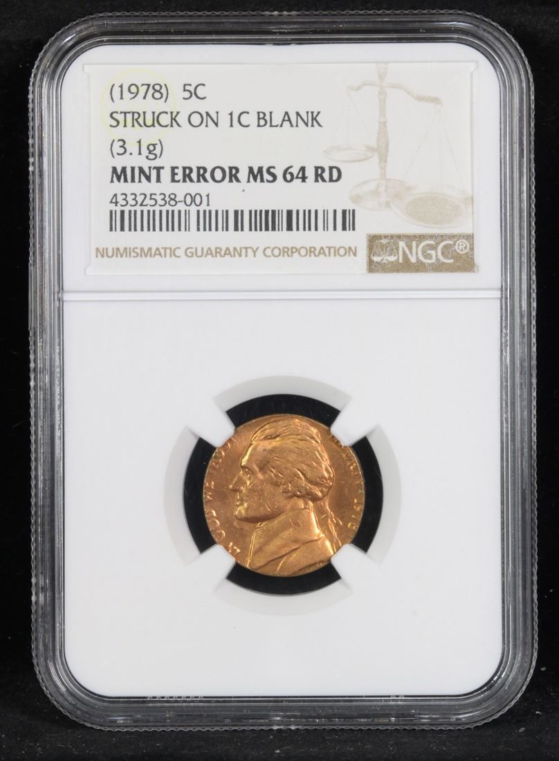 ***Auction Highlight*** 1978 Mint Error Struck On A 1c Planchet Struck on 1c Blank . Jefferson Nickel 5c Graded ms64 rd By NGC. Per Ron Guth of PCGS : The Braided Hair half cents boast some of the lowest mintages of any U.S. coin types and are among the best values, as well. Every date in this type boasts a low mintage. By way of comparison, the mintage of the any Braided hair Half Cent is almost a fraction of the mintage of the 1909-S VDB Lincoln Cent (a far more valuable coin), making this an excellent value.