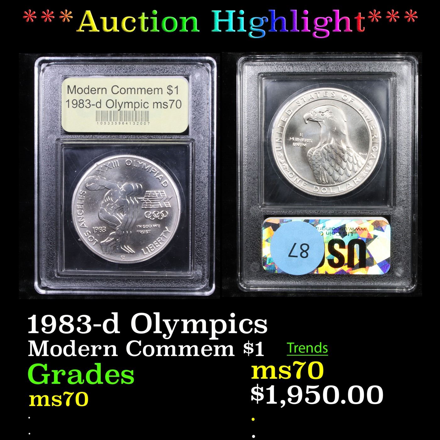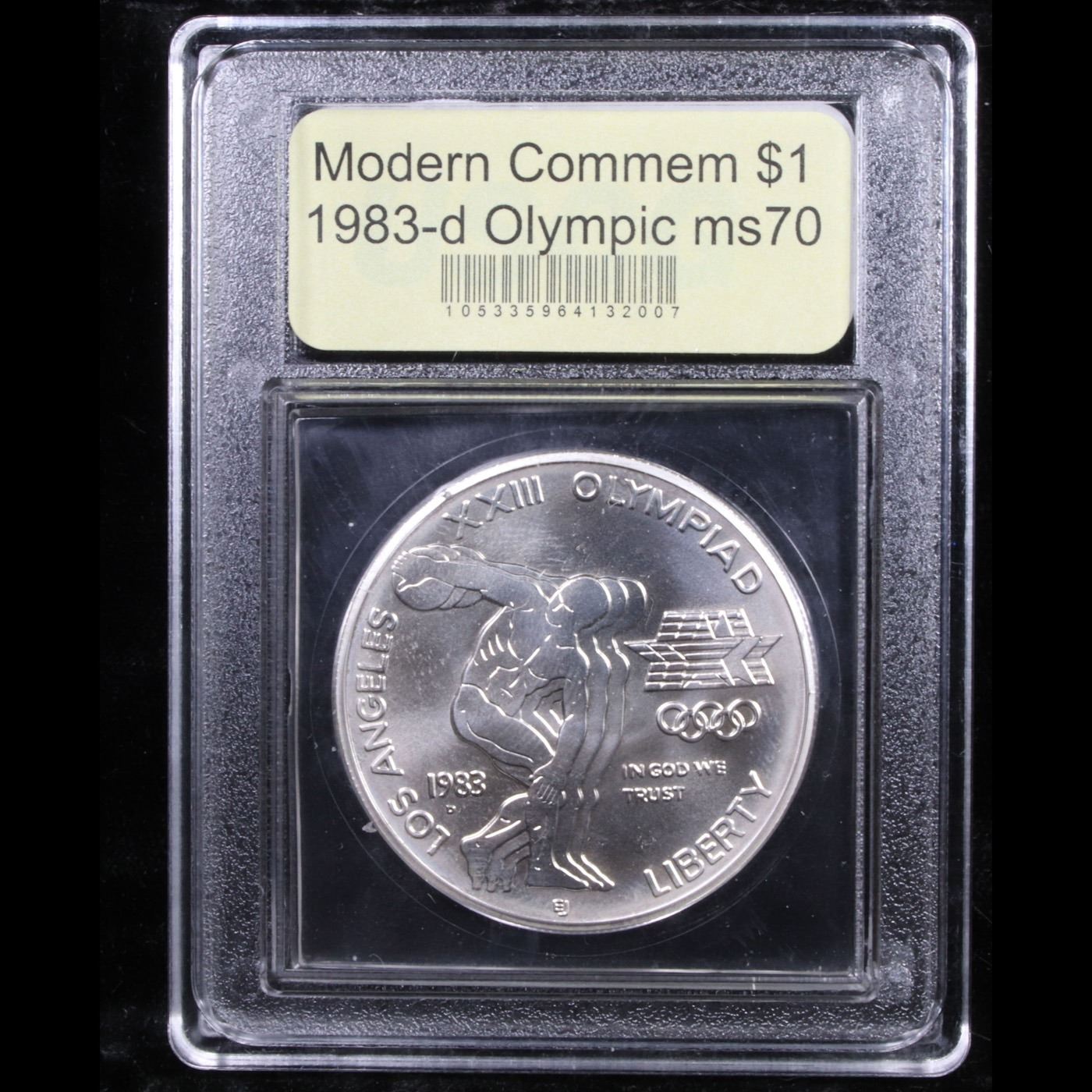 ***Auction Highlight*** 1983-d Olympics Modern Commem Dollar $1 Graded ms70, Perfection By USCG. One of three coins minted in 1983 to mark the 1984 Olympic games. This example is graded Perfection Gem+++ Unc by USCG. Estimated Value $350.