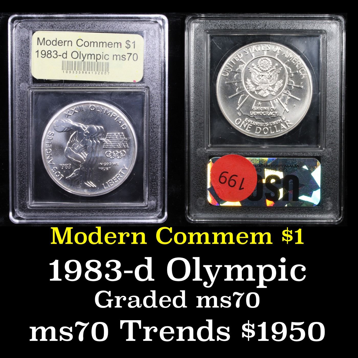 ***Auction Highlight*** 1983-d Olympics Modern Commem Dollar $1 Grades ms70, Perfection. One of three coins minted in 1983 to mark the 1984 Olympic games. This example is graded Perfection Gem+++ Unc by USCG. Estimated Value $350.